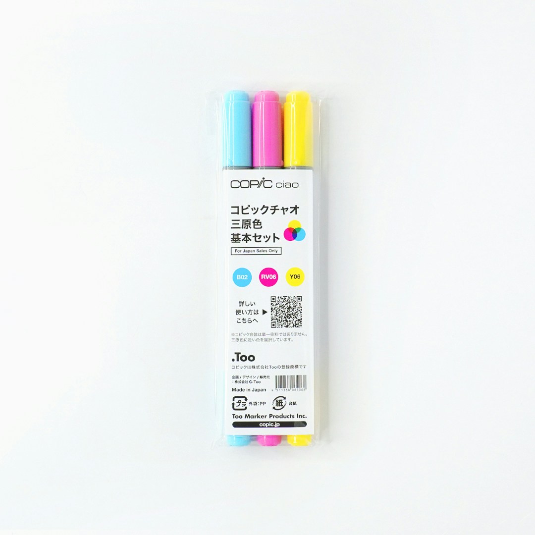 本製品は「コピックチャオ」全180色のなかから、CMYに相当する色である3色(B02、RV06、Y06)をピックアップしたセット。重ね塗りや混色をすることで手軽に色の三原色を学び、美術に親しむことができる。
