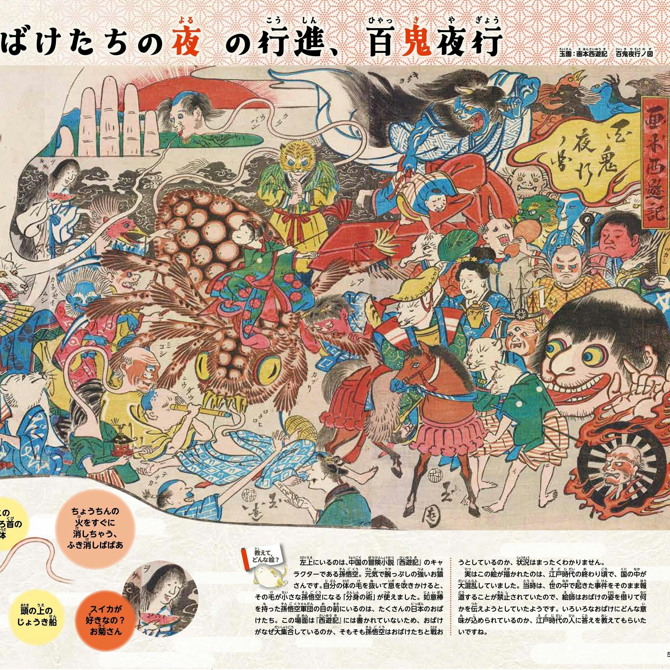 本書に登場するのは、歌川国芳葛飾北斎をはじめとした有名浮世絵師たちが手がけた“ちょっぴり怖い”名画の数々だ。おばけたちを浮世絵のなかから探すあそびを通して「見る」「探す」「発見する」を繰り返すことで、子供の観察力と想像力を引き出す仕立てとなっている。