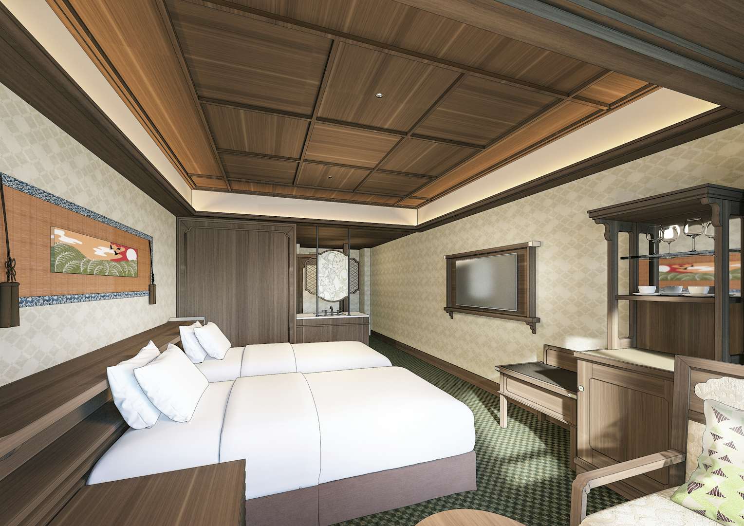 西館のリニューアルコンセプトは「清澄悠然(せいちょうゆうぜん)」。本館が湛えてきた歴史性や静謐な佇まいと呼応しながら、客室やレストラン、宴会場を現代的に再解釈することで、次の時代に向けた奈良ホテル像を提示するという。鉄板焼レストランとして再編される「花菊」や、正倉院文様をモチーフとした宴会場の意匠なども、その試みの一端だ。