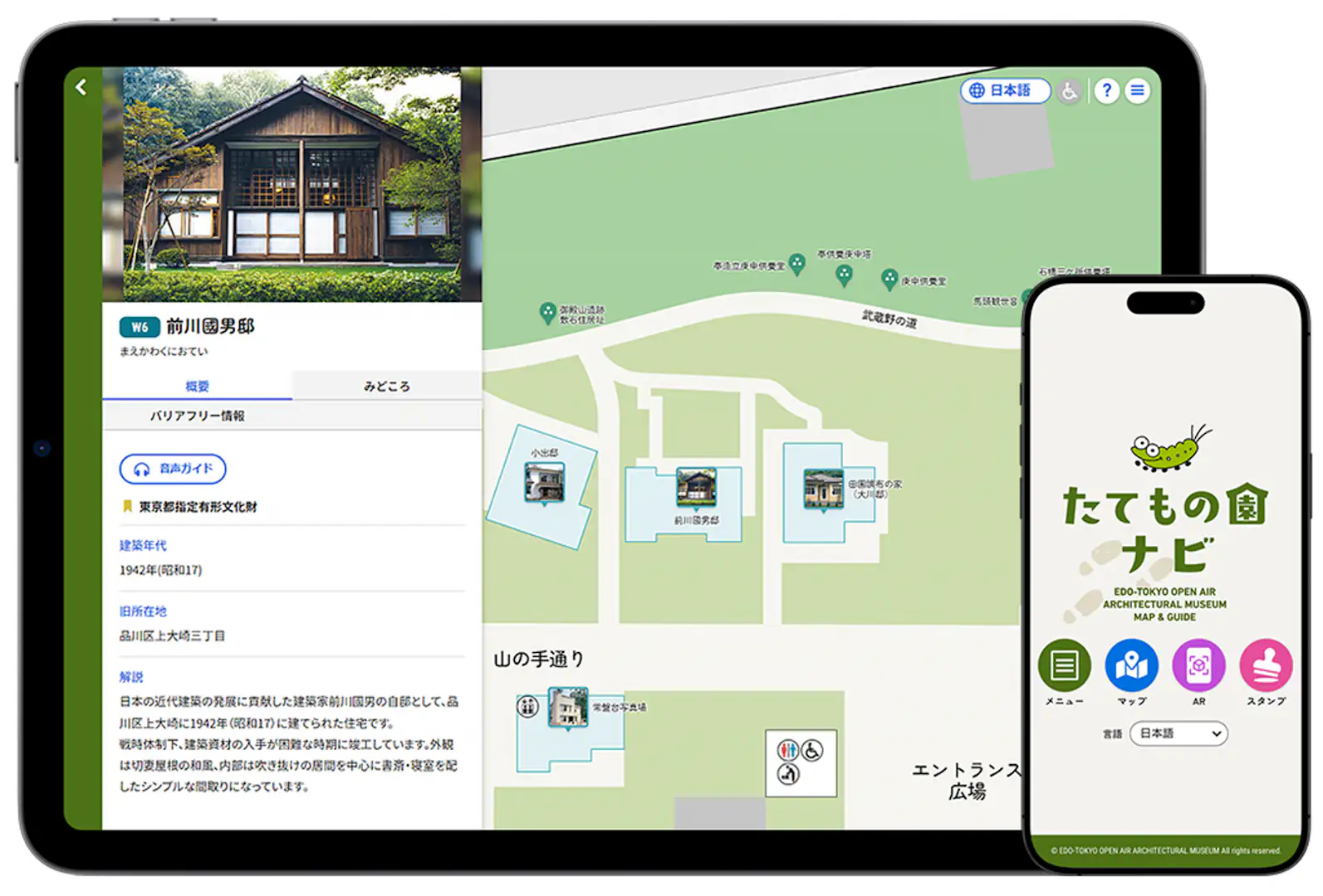また同プロジェクトの一環として、江戸東京たてもの園では、鑑賞支援ウェブアプリケーション「江戸東京たてもの園鑑賞ナビ」を公開中。同園に点在する30棟の歴史的建造物の見どころをAI音声でガイドするほか、GPSによる現在地表示マップ、さらにはAR(拡張現実)技術を用いて移築前の古写真や昔の道具の使い方を閲覧できるなど、園内散策をより深く、快適に楽しめるサービスを提供している。春からは音声ガイド等のコンテンツが5言語に拡充され、新たに韓国語・中国語(繫体字・簡体字)で利用可能となる予定だ。