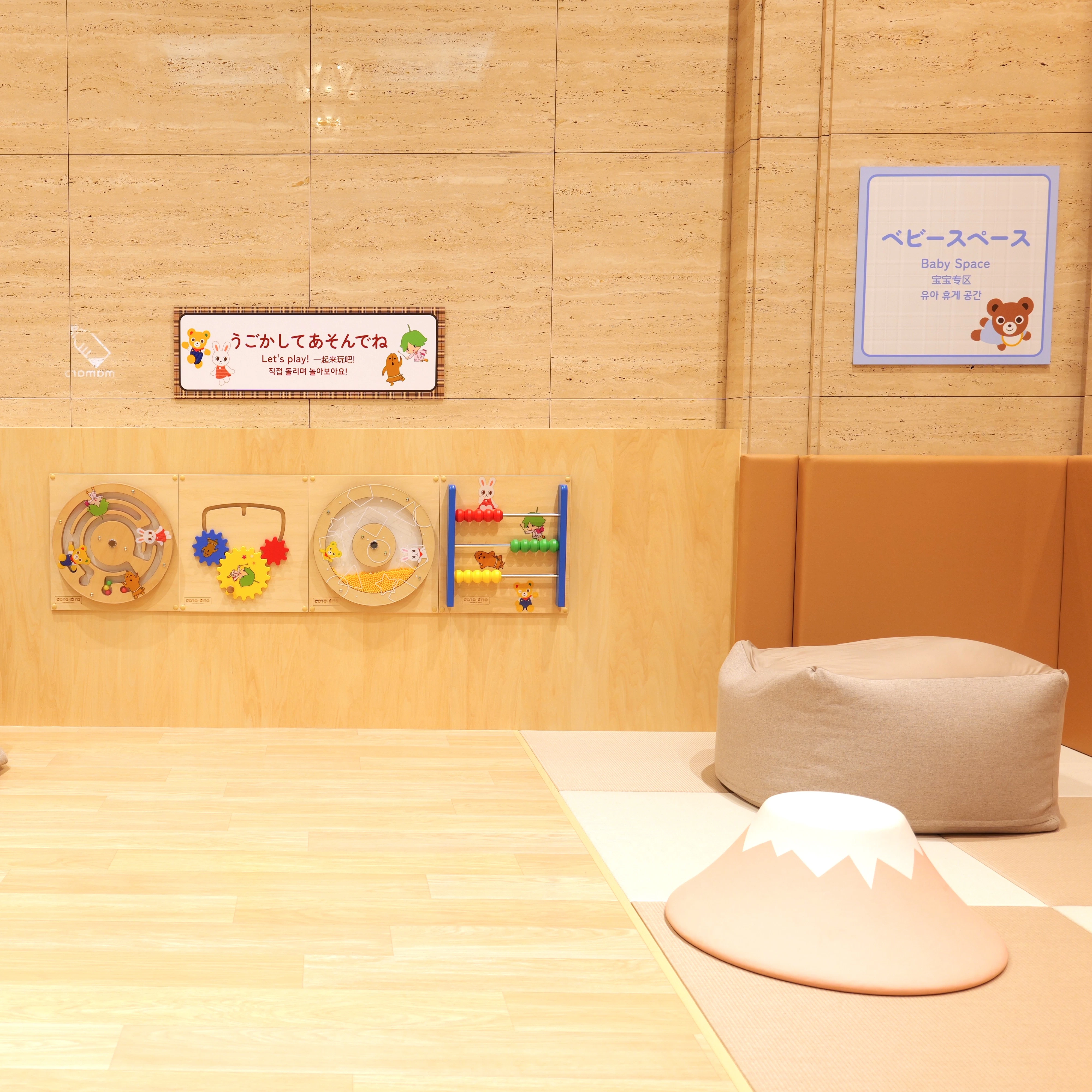 ベビースペースには遊びながら楽しく日本の文化に触れられる環境を用意。えほんコーナーでは「宮沢賢治の絵本シリーズ」を含む約200冊を用意。また、ぬいぐるみや自分で動かして載ることができるクッションなども用意されている。壁面には4種類のウォールトイが設置されるほか、畳の床で、赤ちゃんとゆっくりくつろぐことも可能だ。