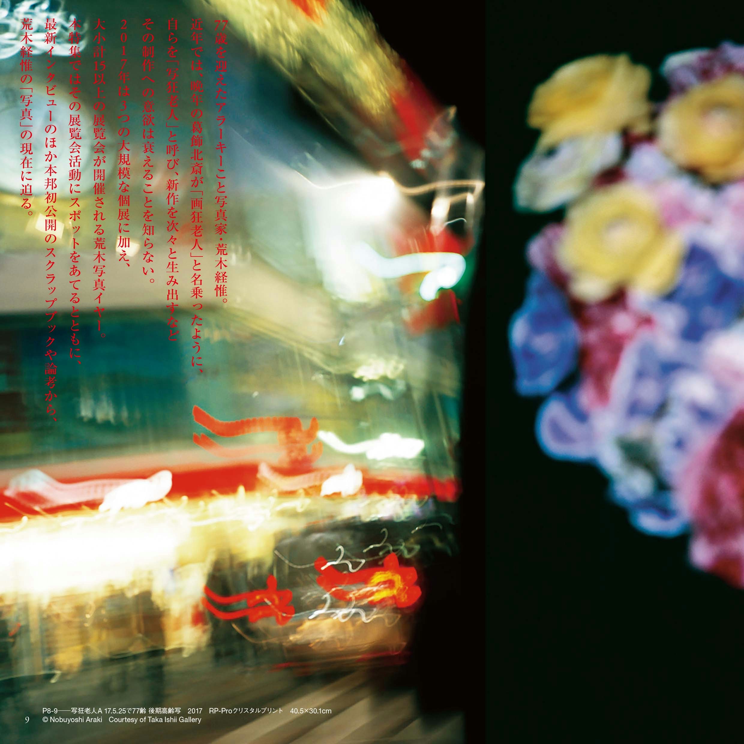 巻頭では鈴木親の撮影による荒木経惟のスペシャル写真も掲載。また特集の核となるのは、2017年の荒木経惟のその驚くべき数の展覧会活動を、作品、本人のコメント、解説、キーワードで、約50ページにわたり一覧し、紹介した「荒木経惟2017 新たなる写真への旅」となっている。