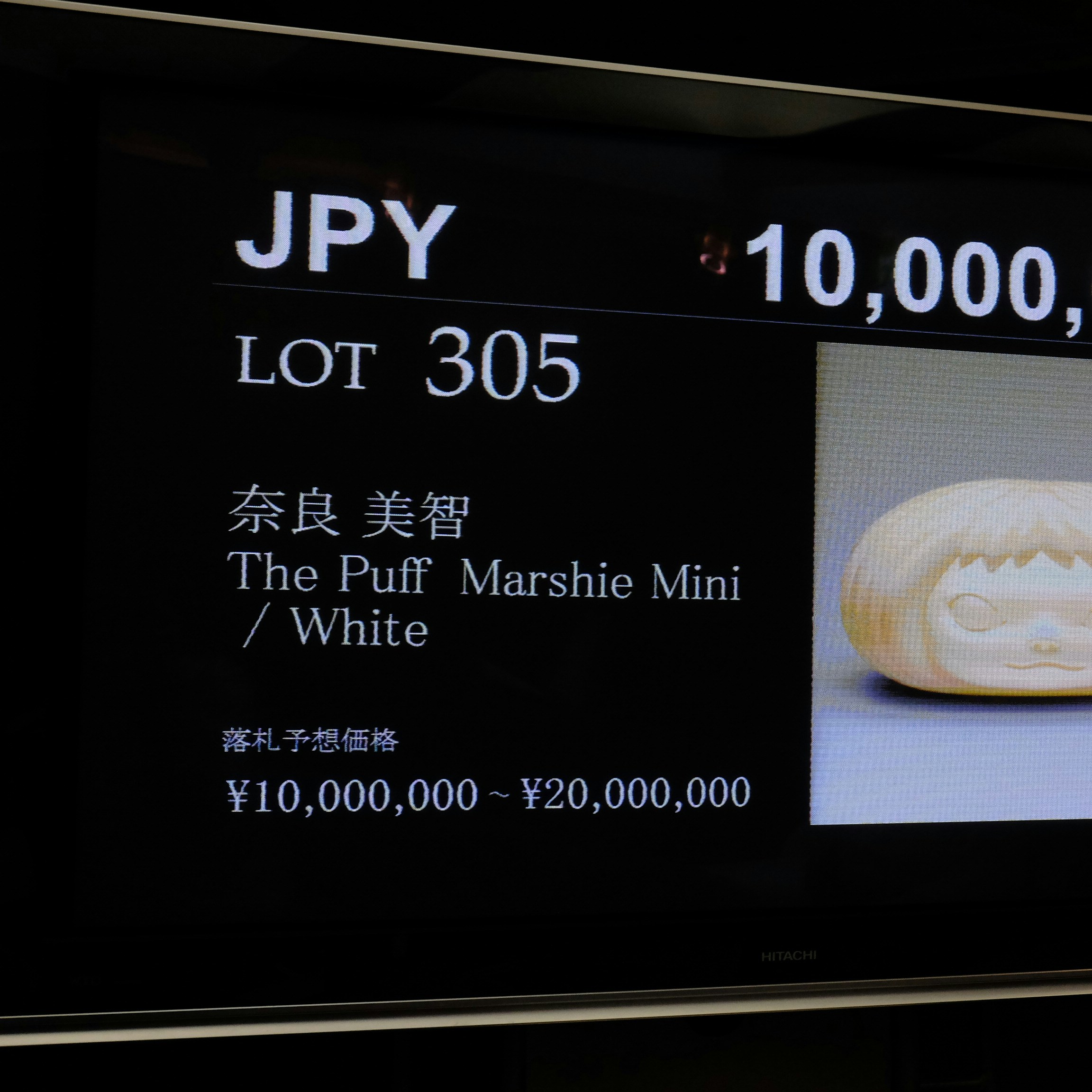 今回出品された現代美術作品のなかで、もっとも高額の予想落札価格をつけたのが、奈良美智の立体作品《The Puff Marshie Mini / White》(2011)だ。予想落札価格は1000~2000万円となり、最終的には1000万円で競り落とされた。
