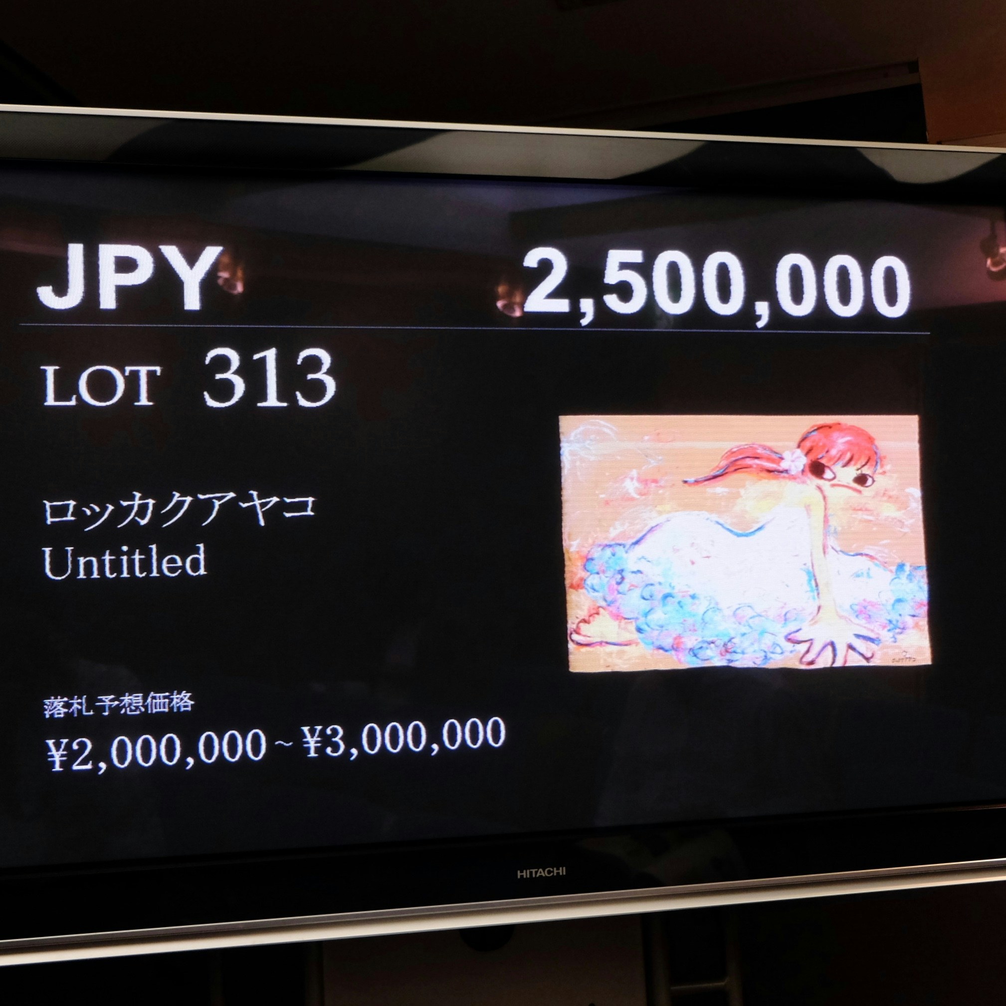 国内のアートオークションにおいて高い人気を集めるロッカクアヤコは、アクリル絵具でダンボールに少女を描いた作品が出品。200万~300万円の予想落札価格が提示され、250万円で競り落とされた。
