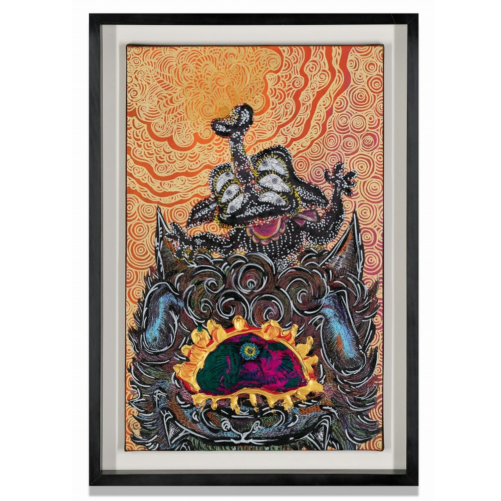 小松美羽もエディション、ユニークともに数多くの入札があった。アクリルペイントのユニーク作品《幻は希望》(2016)は、予想落札価格150〜250万円に対して510万円で落札。シルクスクリーンのエディション作品《干支神獣 猫年》(2018)も、予想落札価格20〜30万円に対して180万円まで競り上がった。