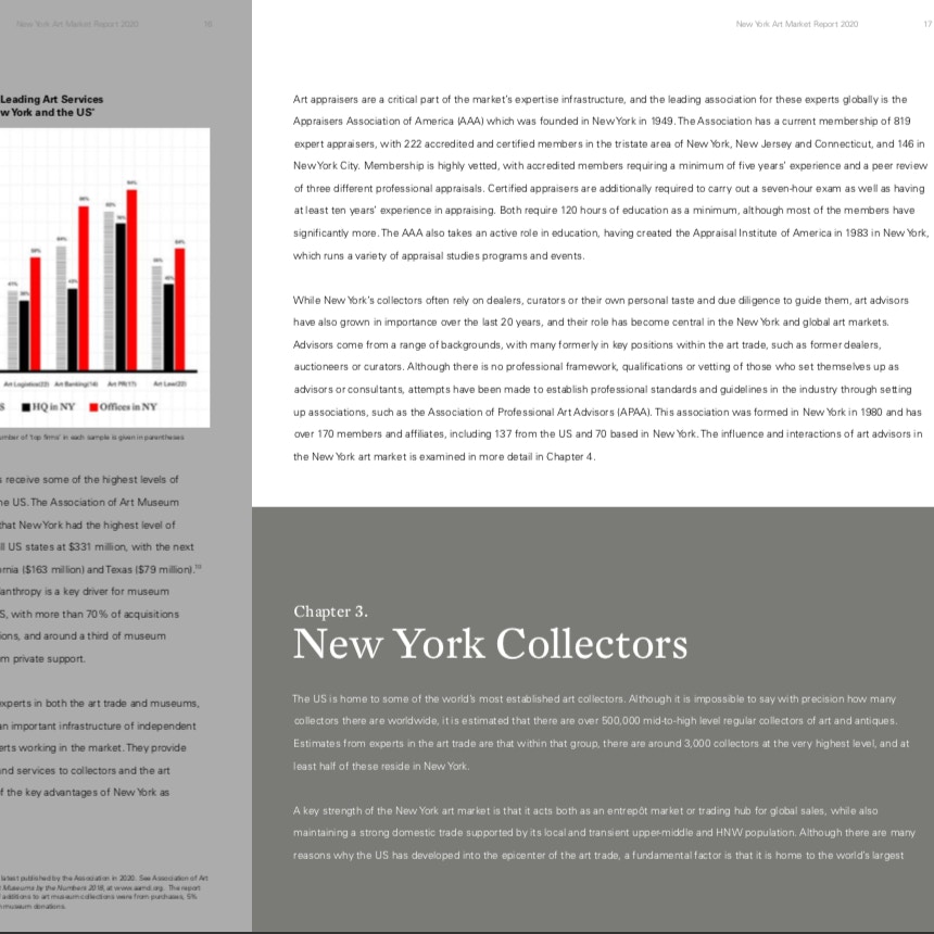 2019年の世界美術品市場の規模は推計641億ドル(約6兆7500億円)で、アメリカのシェアはそのうち44パーセントを占める世界最大の美術市場となっているが、このレポートではアメリカ国内市場における売上の90パーセントをニューヨークが占めていることが示された。また、昨年アメリカで開催された80のアートフェアのうち、40パーセント以上はニューヨークで行われたという。