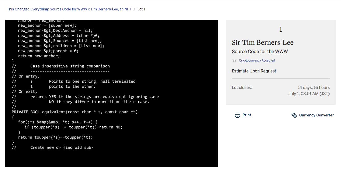 「World Wide Web」のソースコードがNFTとしてサザビーズに出品。入札は1000ドルから