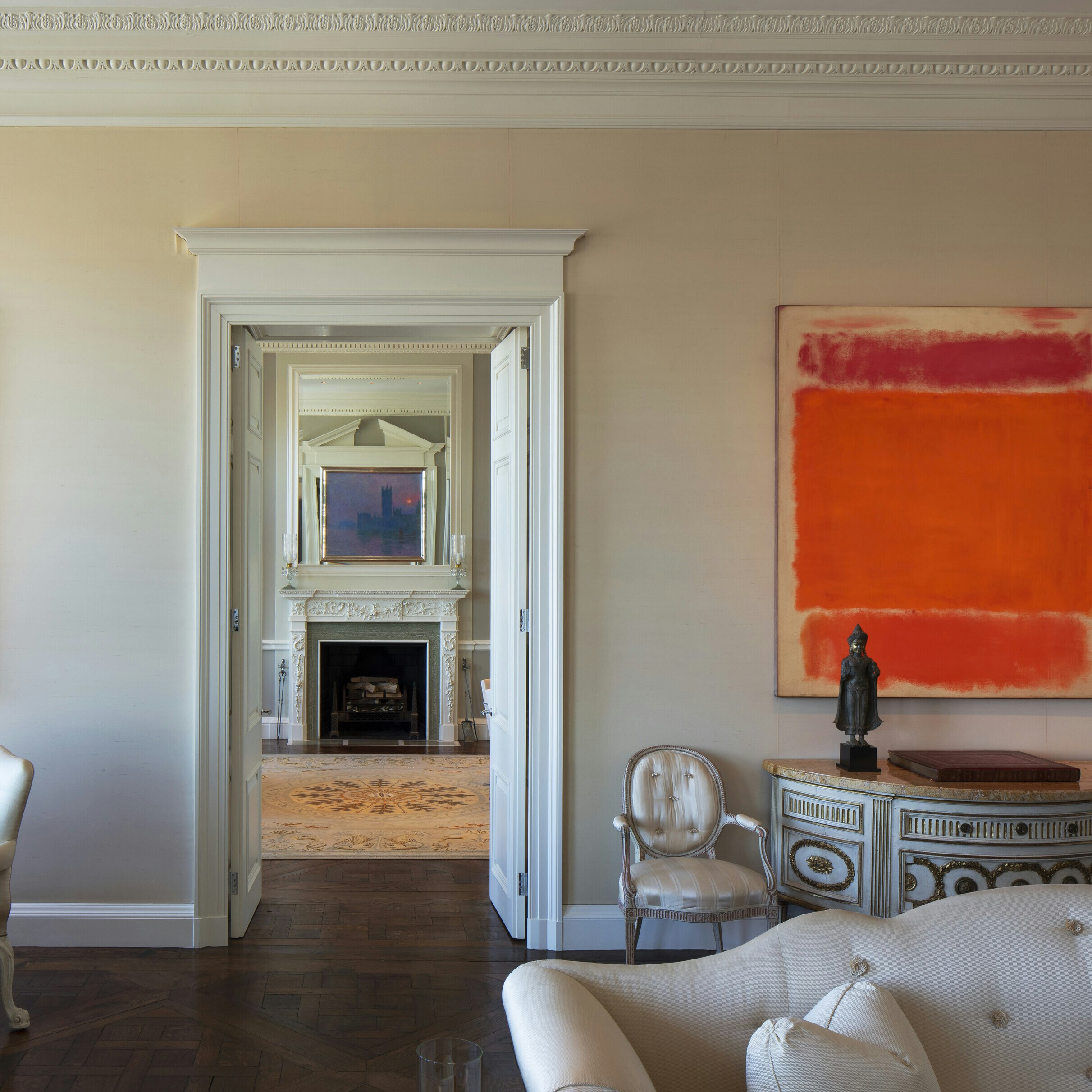 リビングルームに並んでいたマーク・ロスコの大作《Untitled(Shades of Red)》と《No. 1》は、同セールのハイライトとして出品。それぞれ6000万ドル〜8000万ドル(約74億円〜99億円)と4500万ドル〜6500万ドル(約56億円〜81億円)と推定されている。