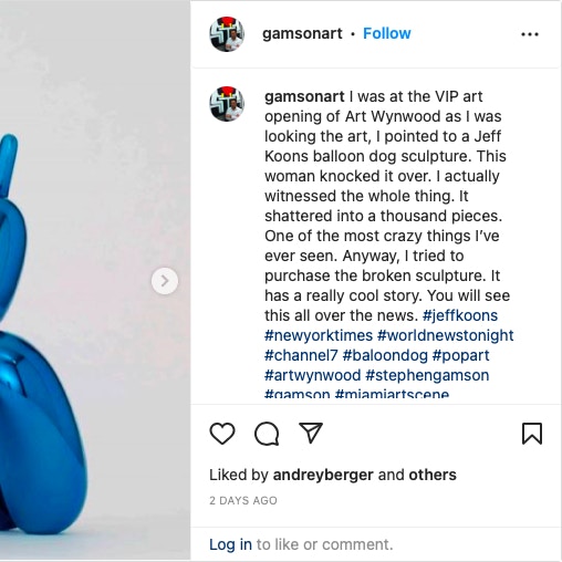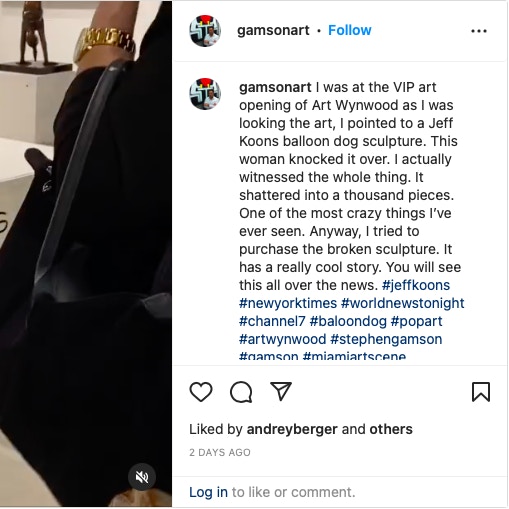 アメリカのコレクターであるステファン・ガムソンは、自身のInstagramで彫刻の破片を撮影した動画を投稿し、女性のコレクターが作品を倒した一部始終を目撃したことをコメント。また、「Miami Herald」に対しては、彫刻が地面に落ちる前に同女性のコレクターが彫刻を叩いていたと話した。