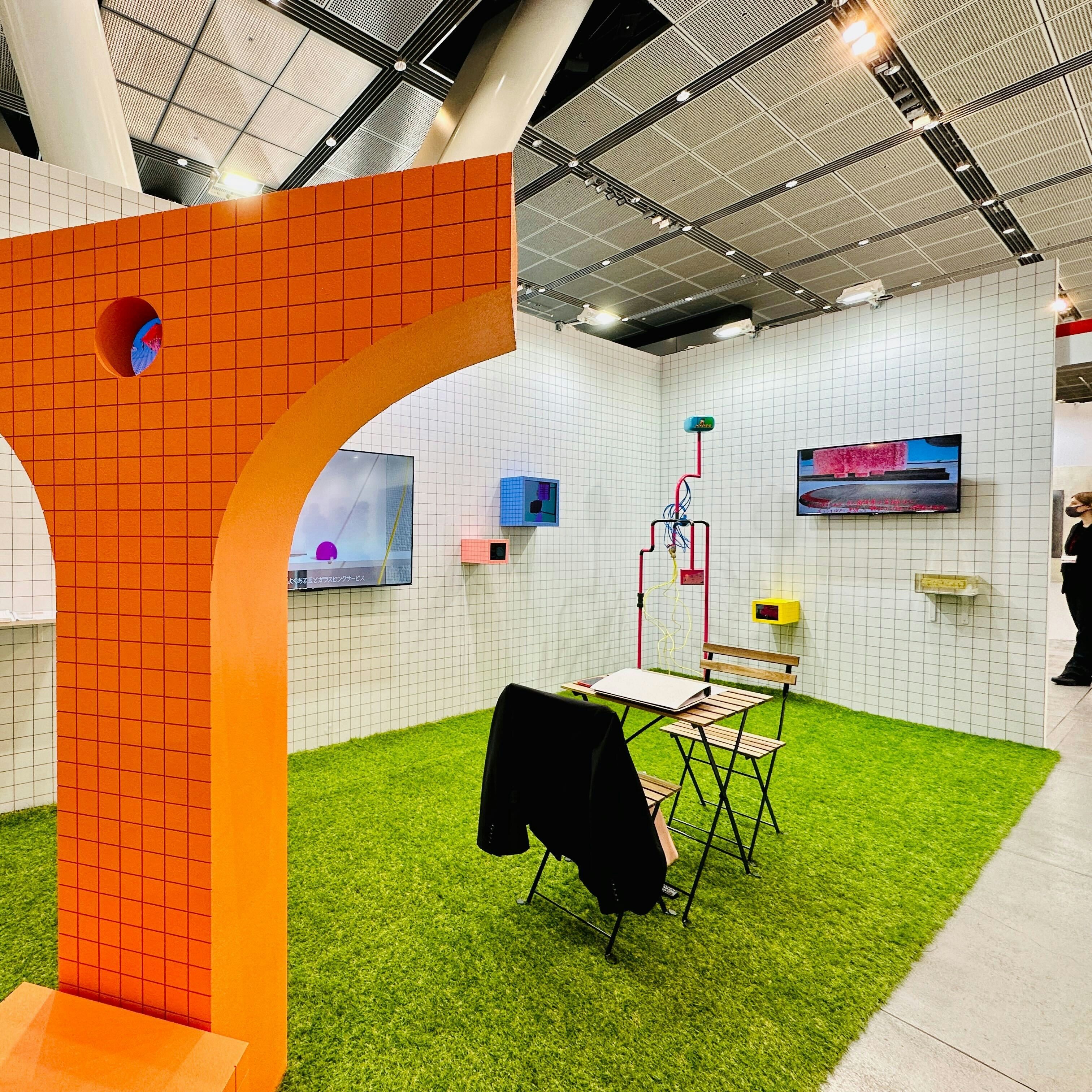 作家の世界観をブース全体でアピールしたWAITINGROOMでは、アーティスト・藤倉麻子によるCG映像作品を出展。現実世界のモチーフが、別の性格を帯びて独特な動きを繰り返している藤倉作品の世界観を、同フェアのためにつくられたタイルや芝生、水道管を用いて表現。参加者としても思わず引き込まれてしまう空間設計なのではないだろうか。