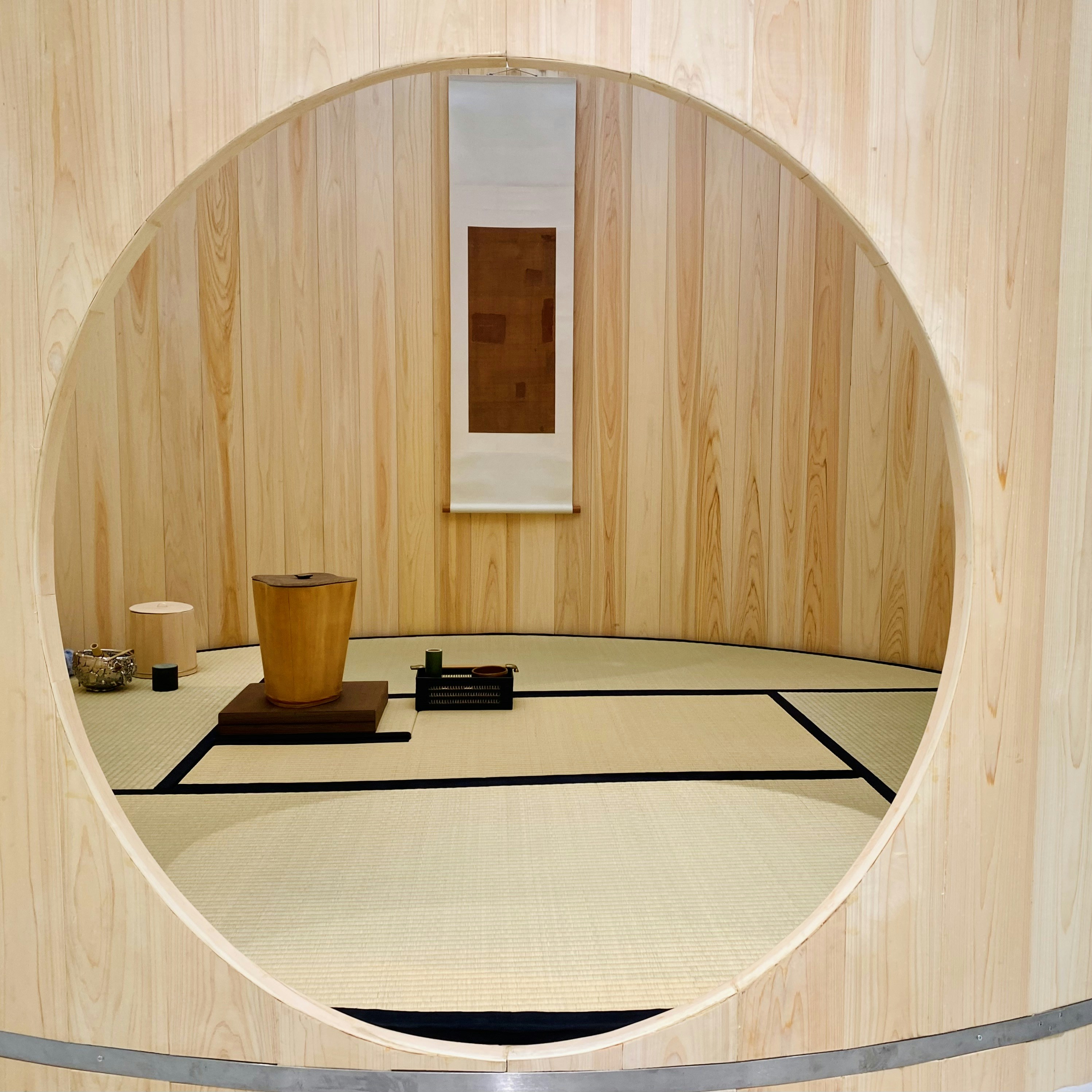 2階スペースに、木工職人・中川周士の手による《木桶の茶室》が出現。その内部に入って、裏千家今日庵業躰・奈良宗久による茶席「MUFG茶会」を楽しめるようになっていたのだ。