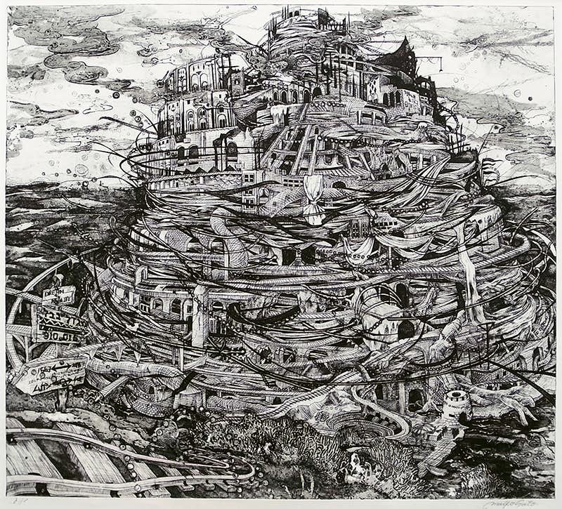「私の使用している板紙凹凸版は、光沢白ボール紙を版に用いた技法です。まだまだ知名度も低く、発展途上の技法ですが、これを用いた作品を評価して戴けたことを嬉しく思います。以前から複雑な構造の鳥巣に魅力を感じ制作しており、本作ではピーテル・ブリューゲルの『バベルの塔』に感銘を受け、リアリティのある細密表現と幻想的な世界観の両立を目指し、取り組みました」