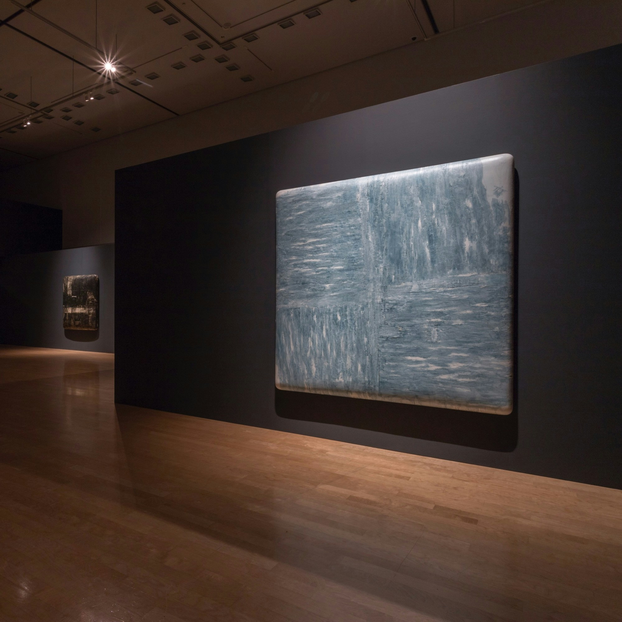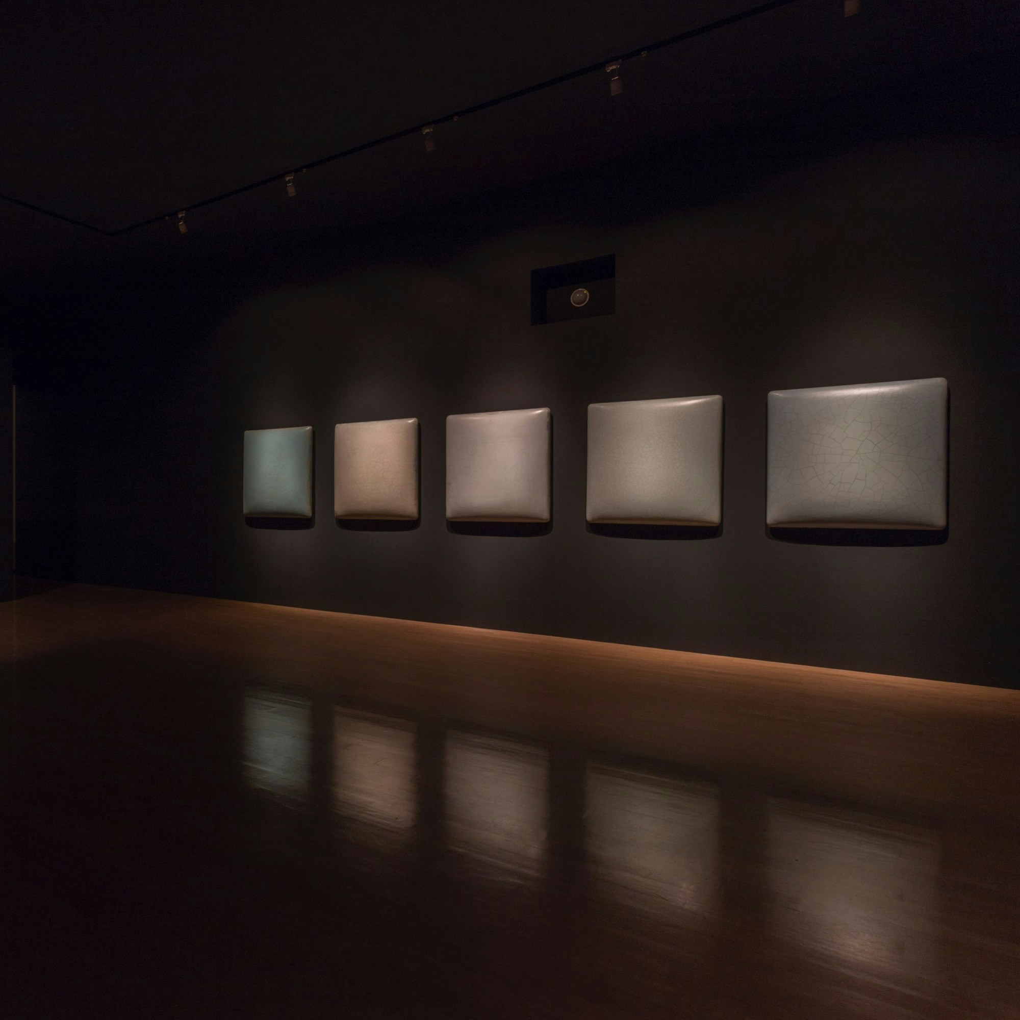 さらに長い壁に沿うように、磁器のような表面を持つ「天清」シリーズ(2018)が展示されている。滑らかな画面に、それぞれ異なるひび割れが入っており、そこにはなんらかの物語が込められているように見える。しかし、蘇は、「物語はストーリーを欲する人に残してあげましょう。私は少しの光、平面の上に戯れるわずかな起伏と、若干の色彩、そして流動さえあれば十分なのです」と語る。