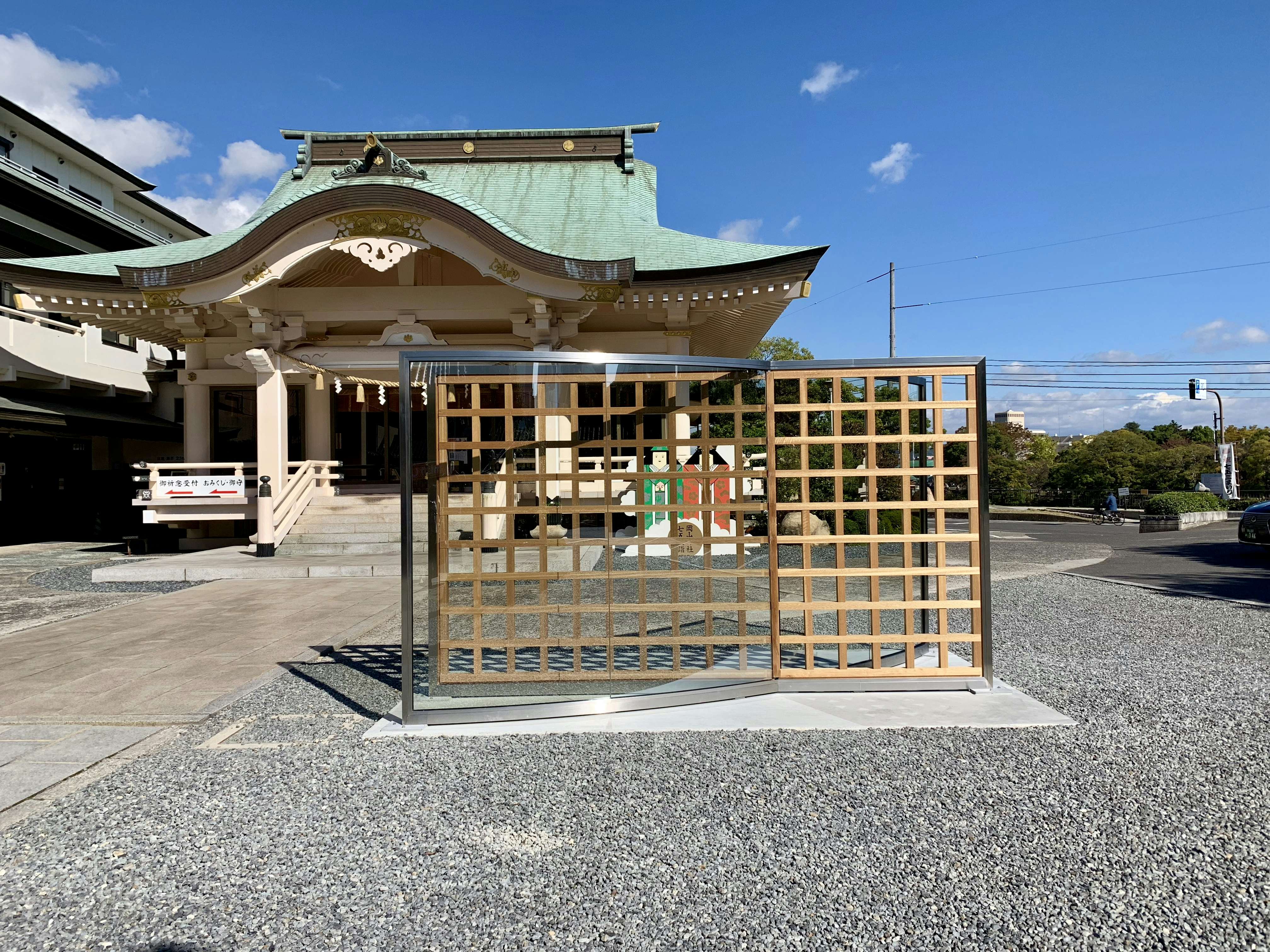 岡山神社に設置されたダン・グラハム《木製格子が交差するハーフミラー》(2010)