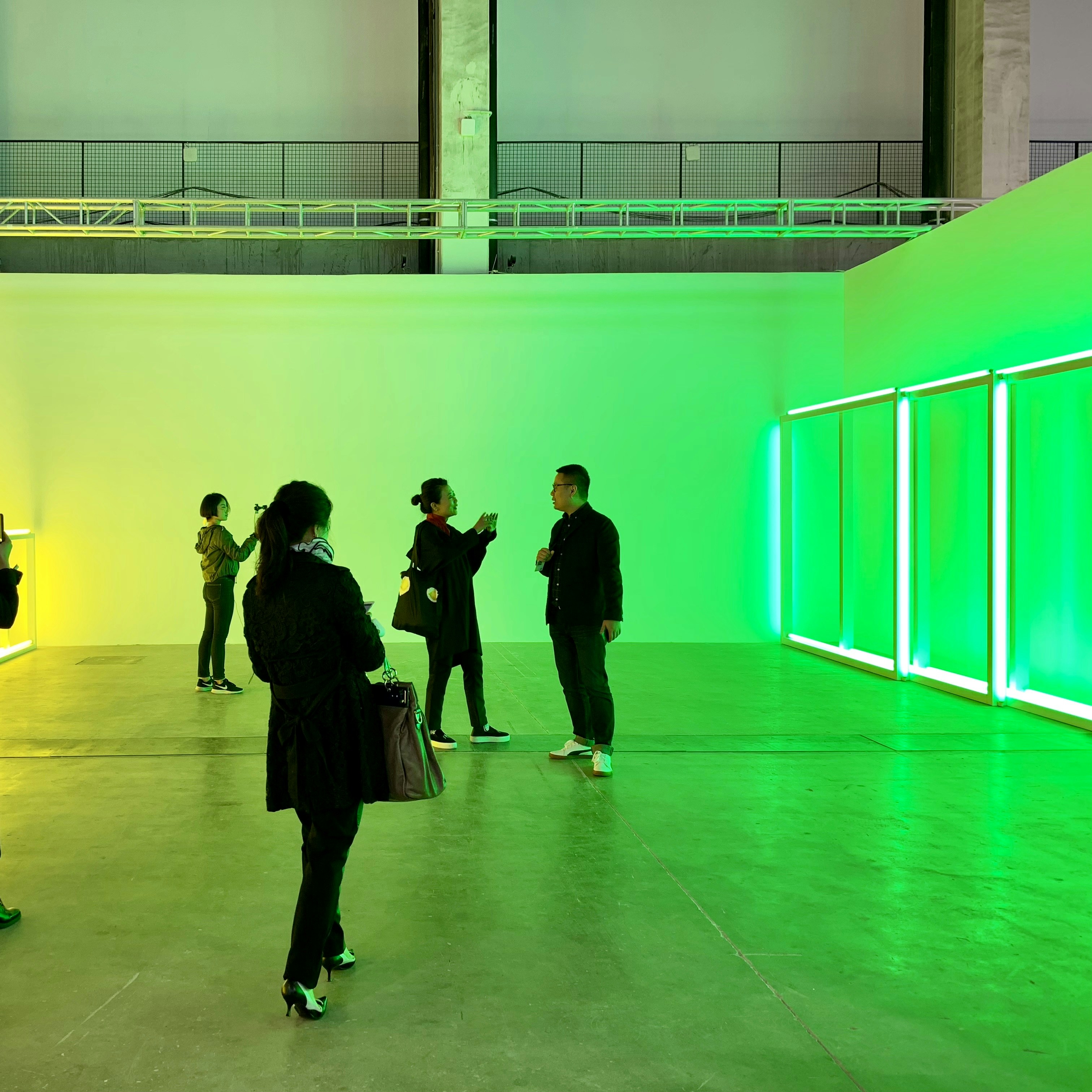 緑と黄色、2色の蛍光管からなる作品《untitled (to Sonja)》は、フレイヴィンの最初の妻であったソーニャに捧げられたもの。フレイヴィンの作品としては珍しい、2つのパートで構成された作品をミニマルな空間で体験できる。
