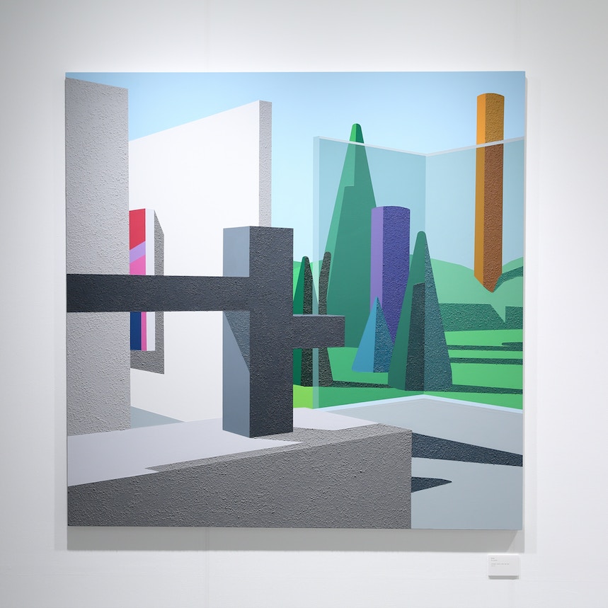 まず紹介するのは、原田郁の新作《GARDEN - WHITE CUBE(G8) #001》だ。「SketchUp」という3DCGのソフトウェアを使い、家やオブジェのある架空の世界をつくり、そこで疑似体験した風景を絵画として描き続ける原田。本展で展示する新作は、会場であるクリエイションギャラリーG8の様子をモチーフにしているため、照らし合わせるように鑑賞することをおすすめしたい。