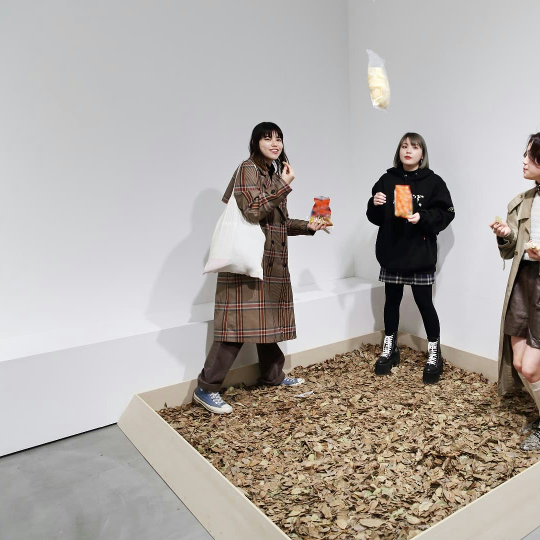 また、本会場で異彩を放っているのが、「Wieden+Kennedy Tokyo」でエグゼクティブ・クリエイティブ・ディレクターを務める長谷川踏太の作品《枯れ葉踏みとポテトチップス》だ。この作品では、幼少期の長谷川が思いついた「ポテトチップスを一番おいしく感じられる食べ方」が再現されているという。目の前にポテトチップスが浮かび、足元にはザクザクと乾いた音を立てる枯葉が敷き詰められているなど、五感を使って体感する本作は、会期中15:00〜16:00の1時間限定で、作品の中で実際にポテトチップスを食べることができる。