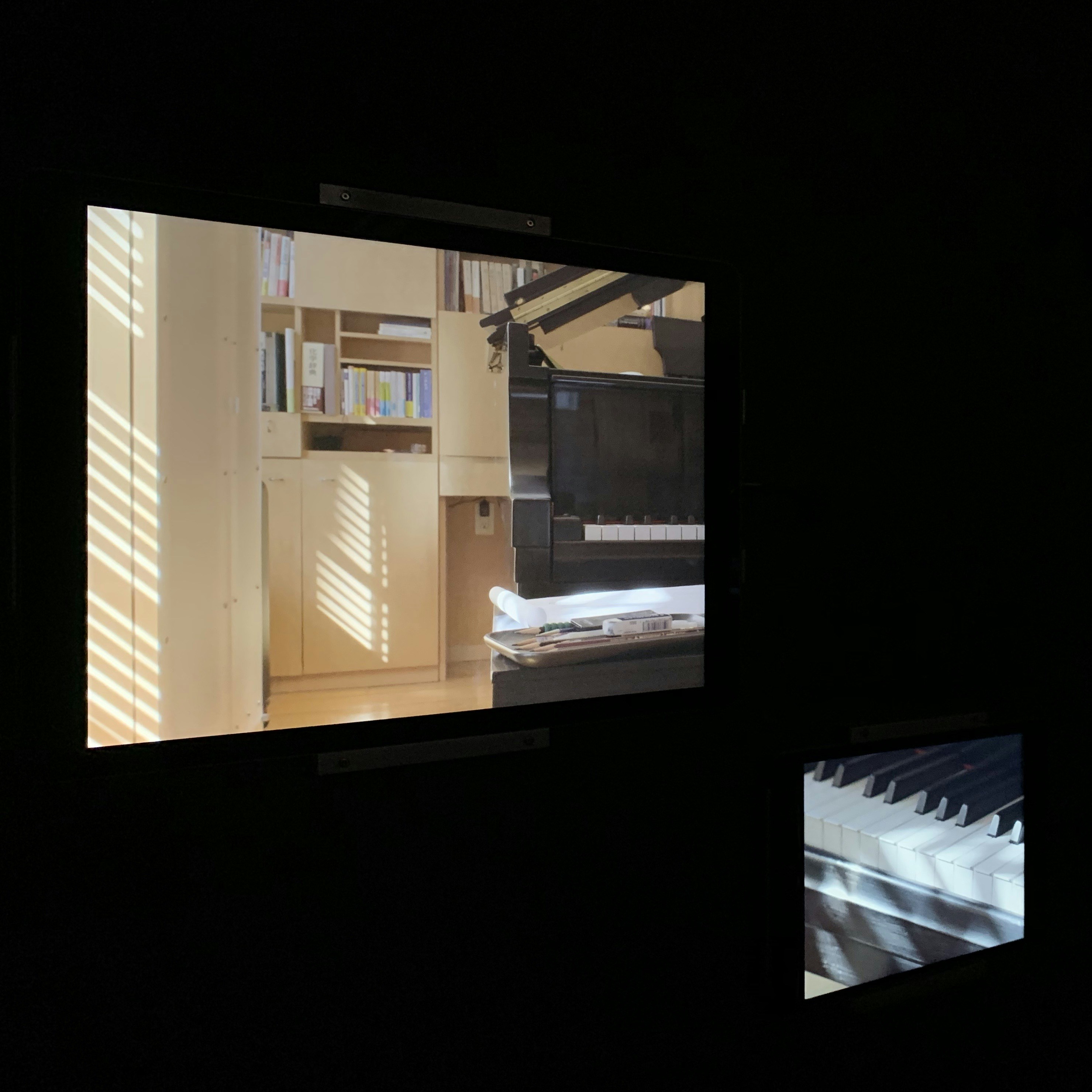 ニューヨークを拠点とするアーティスト・デュオ、ザックバランが坂本龍一と共同で制作した《async – volume》(2017)は、坂本が2017年に発表したアルバム『async』からの音楽をもとに、作曲家のスタジオとその周辺を舞台にした映像インスタレーション。暗い部屋に24台のビデオスクリーンが置かれる本作では、音楽と視覚について瞑想するような空間がつくりだされている。