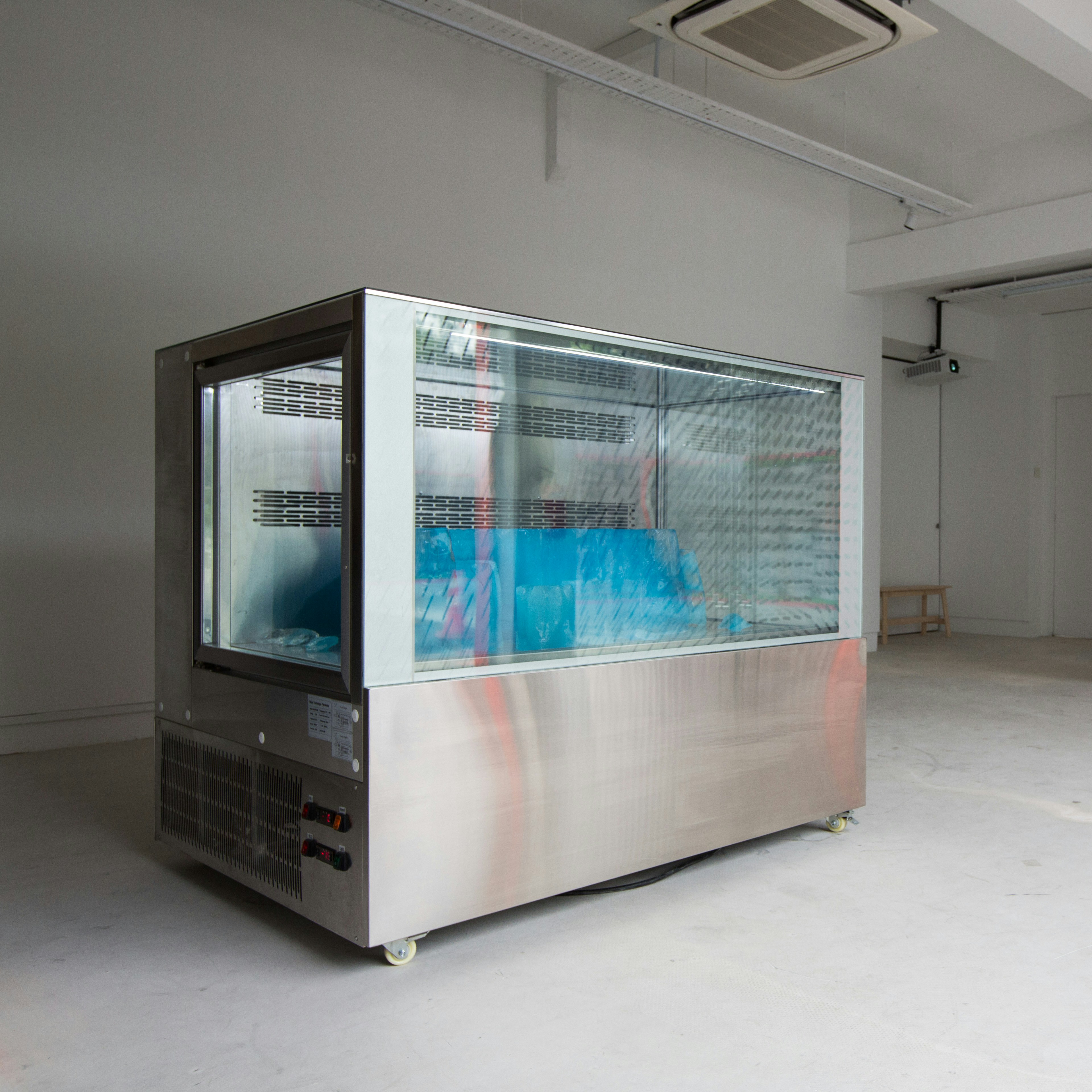 胡昀(フー・ユン)は、《Carving Water, Melting Stones》(2019)を発表。同作は、映像と立体からなる作品。映像では、東南アジアでかつてよく見られたキリストの木彫製作者の故郷・フィリピンのパエテを訪れ、消えていく木彫り師の姿をとらえた。また、映像作品の隣には巨大な冷蔵庫が置かれ、その中にはシンガポールの小学校の生徒たちと協力し制作した、現在のシンガポールの地形に基づいた氷彫作品を展示。それらふたつによって、東南アジアの過去と現在を対話させる。