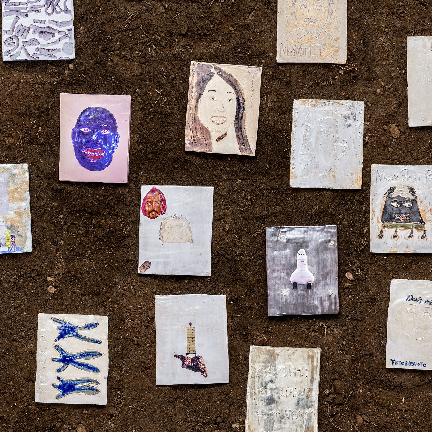 本展を開催する会場「AOYAMA STUDIO164」は、オフィスビルだった空間をギャラリーにリノベーションした場所。根本はその立地条件からインスピレーションを受け、オフィスを舞台にした展示を行う。妄想から生まれた「うんこに埋まっているおじさん」=「New Shit President」が面接会場に訪れたところから始まる本展は、2.5トンにおよぶ大量の土を用いた新作がメインとなって展開される。