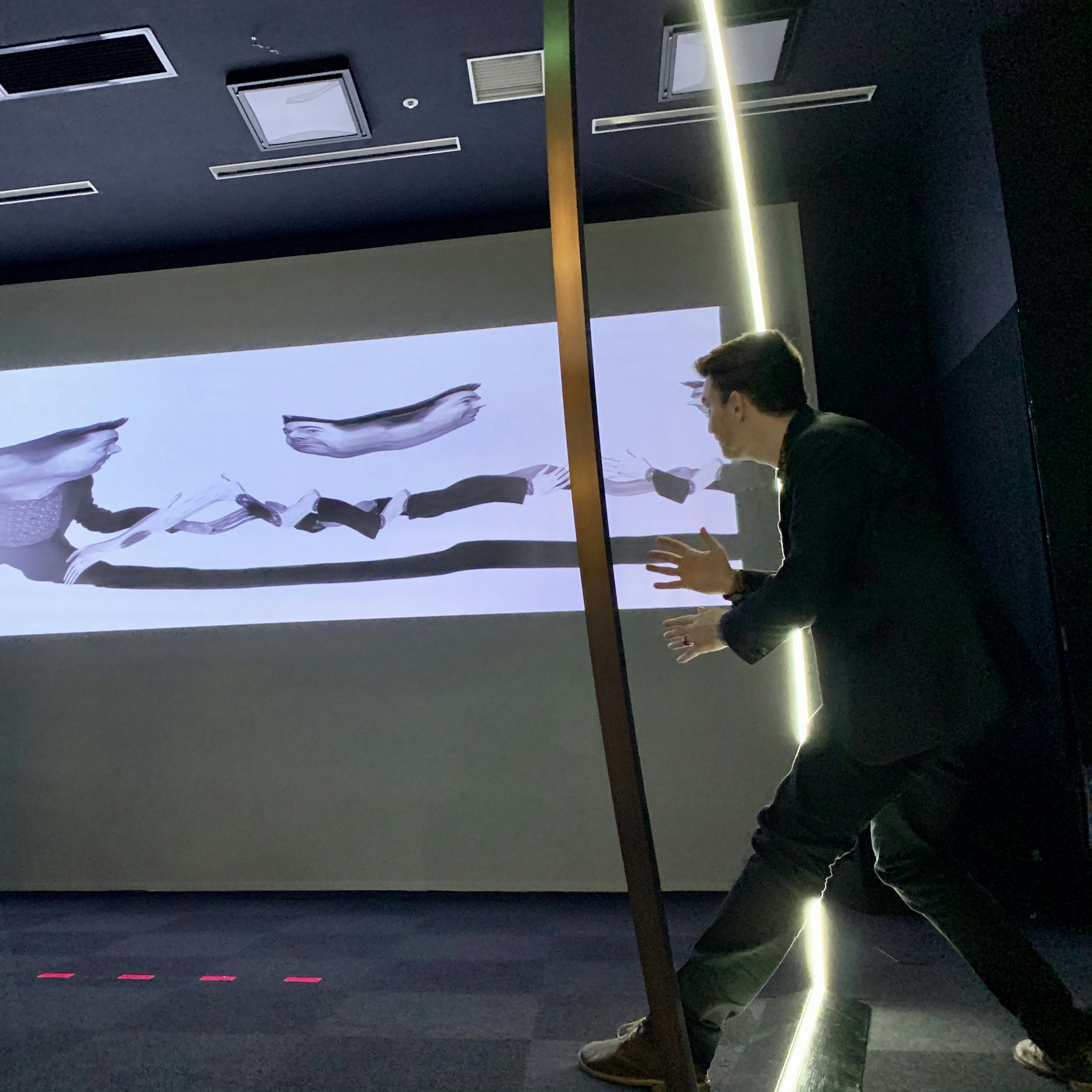 競馬でも用いられるという「スリットスキャン」と呼ばれる撮影技法を用いたこの作品。光のリングをくぐることで画像が残像のようにスクリーンに残り、少し前の過去を映し出す。現実はどんどん過去になっていく、というごく当たり前ながら普段は意識しない事実を、エンターテインメント要素を含む体験型のインスタレーションで提示する。