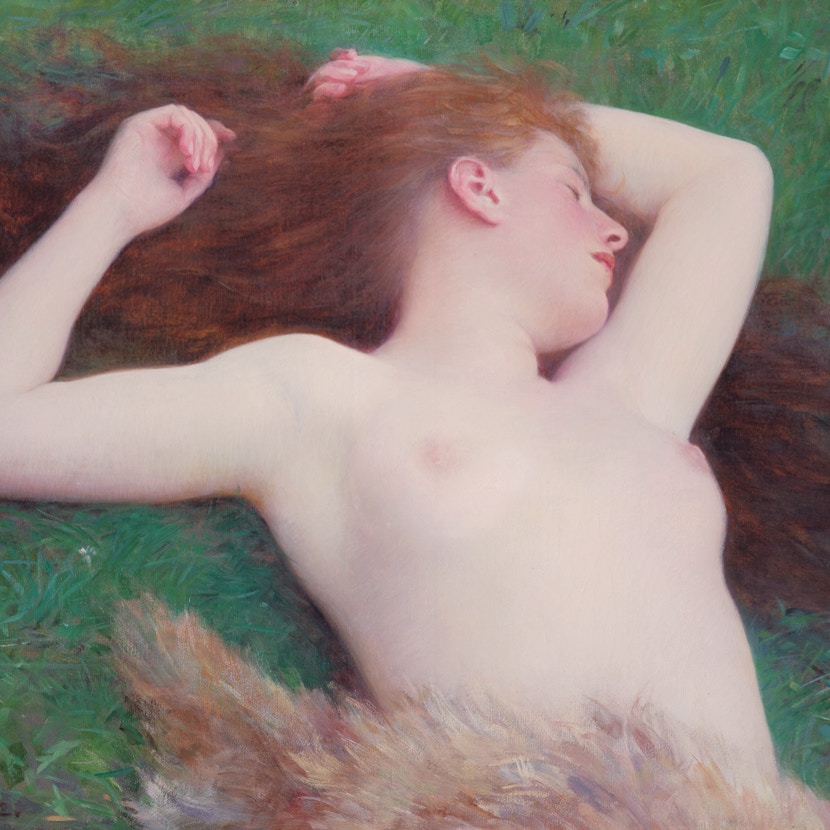 さらに本展は、歴史的発見にも恵まれた。黒田清輝の作品《野辺》は、1900年のパリ万博で黒田が見た師ラファエル・コランの《眠り》に大きなヒントを得たとされているが、コランの同作は長らく所在不明だった。ところが近年、パリのある財団内で発見されたのである。120年の時を経て、世界で初めて2つの作品が並んで展示される。