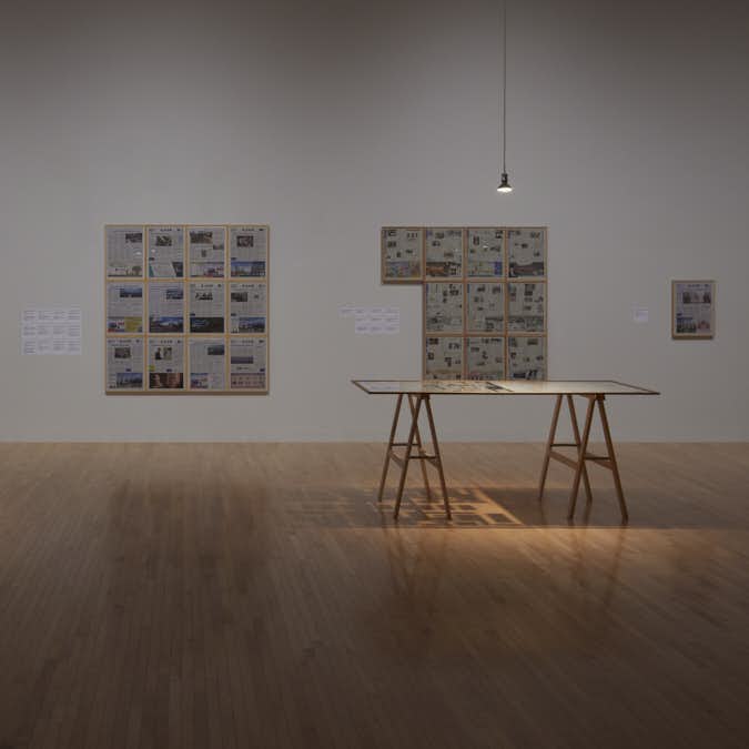 会場を進むと、参加者である14歳の中学生参加者が「身の回りにある“境界線”」を探し、それを文章に書いてもらい、地元新聞の連載として発表するプロジェクト《14歳と世界と境》を紹介。2013年のあいちトリエンナーレで始まったこのプロジェクトは、尾張と三河というふたつの地域に分かれ、奇しくもその境界を境川という川が流れていることに着想したのだという。大人と子どもの境目ともいえる14歳という年齢。中学生が書いた文章は新聞に連載形式で掲載され、様々な大きなニュースと並ぶ。さらには韓国や香港、岡山などでもプロジェクトを実施した。
