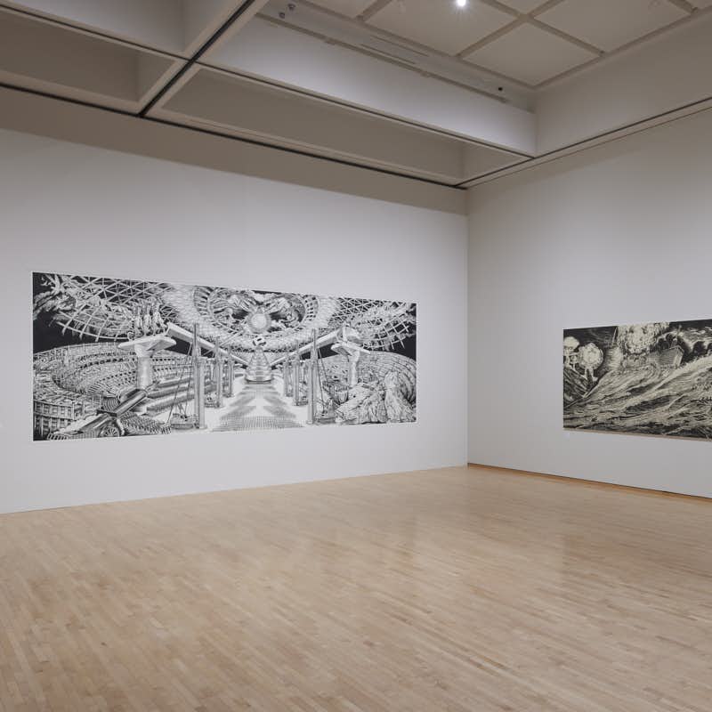 展示冒頭の山がモチーフの作品から、『魔の山』に現在の私たちの社会状況を重ねた作品、また、後半に展示されているオリンピックや東京の景色をダークに描写した作品など、大型の作品の展開に圧倒される。色々な場面で生じる違和感が風間の制作の原動力となり、それが力強い版画のモノクロに昇華していることが伝わってくる。