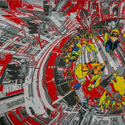 本展では、近藤は緊急事態宣言が発出された主な地域、「東京・大阪・京都・兵庫」を題材とした新作4点を発表。ウィズコロナの状況のなかで取り組んだこの「Drip color link series」では、虚構でつくり出された街並みと行き交う人々とが、モノクロームとヴィヴィドな色彩で画面上に描き分けられる。