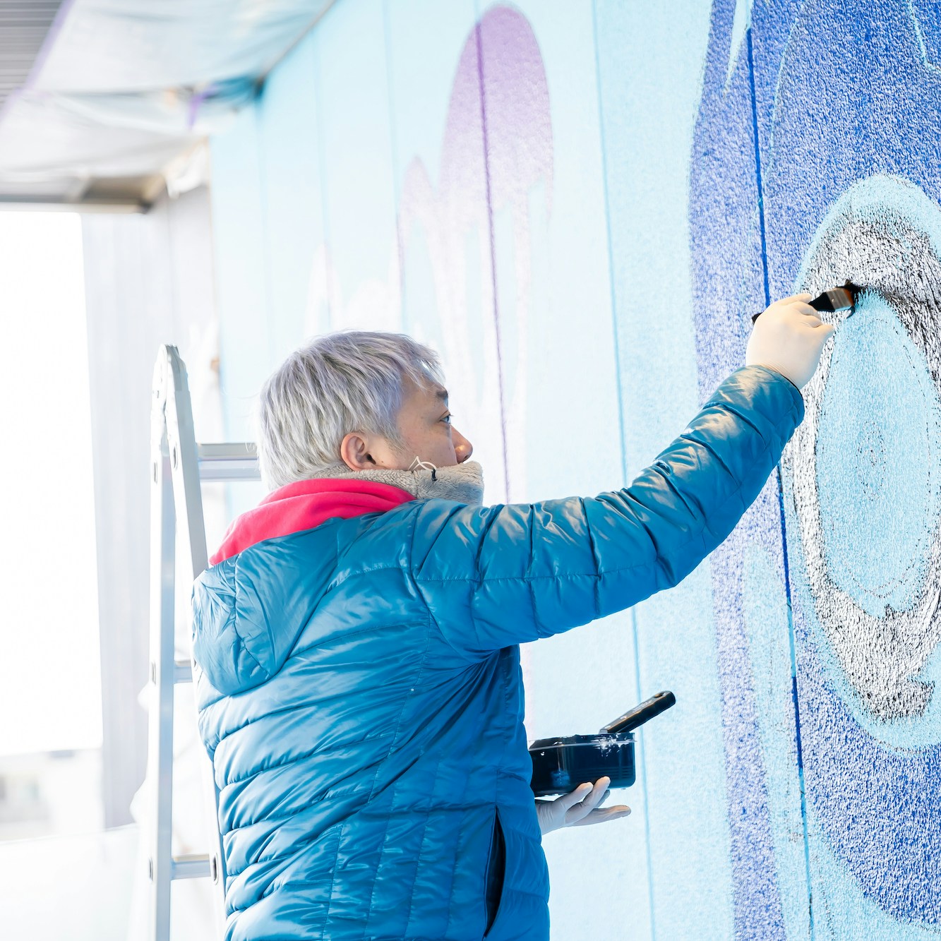 若佐慎一は、7体7色の招き猫、そして壁面全体にはキラキラ星と、平和の象徴として白い鳩を描く予定。多様性を象徴する虹色の配色で招き猫を描くことで、2045年の未来では多様性が当たり前になっていてほしい、という願いが込められているという。