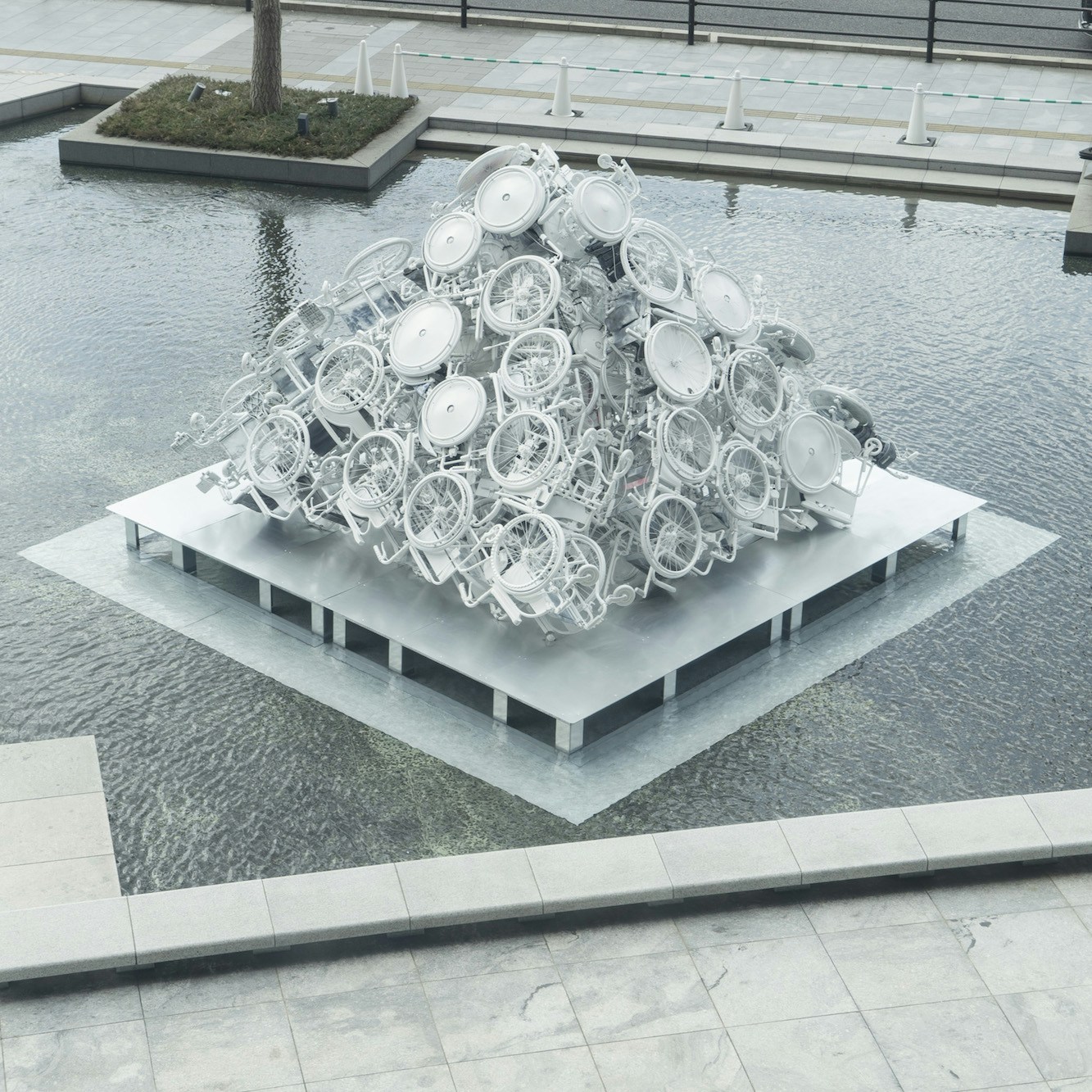 南館せせらぎテラスでは檜皮一彦が「hiwadrome」シリーズの抽象度をより高めた新作《hiwadrome typeΔ》を展示。檜皮にとっては地元大阪初の展示となる。身体性をテーマとした映像や、自身も使用する車イスを用いたインスタレーション作品を制作してきた檜皮の新たなオブジェが、テラスの水景に存在感をもって現れる。
