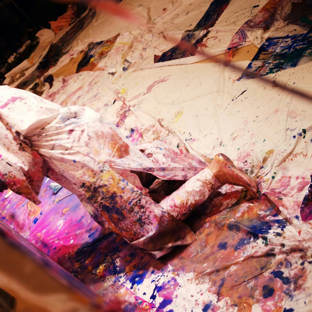 ペインティングを共に過ごした布や、解体した衣を染めて、キャンバスに張り、破かれた紙やビニールがコラージュされる。その絵を描くときに下に敷く布や衣はまた、その場の時や空気を纏う。そしてまた絵になっていく。