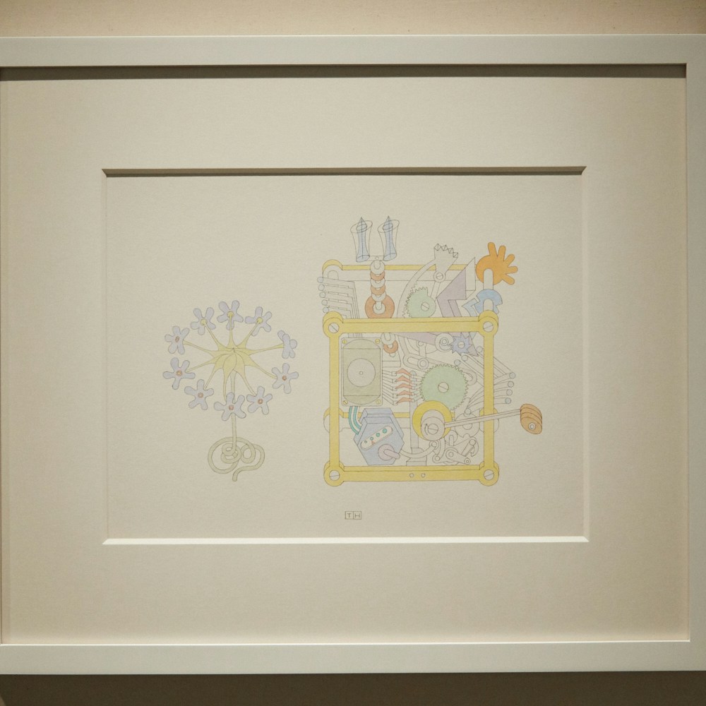 昆虫や植物、ボルトやナットなどのかたちをモチーフとした空想上の機械や物語。身近なものや散歩で拾ったものから発想を広げて描いたのは濱中徹(1948年兵庫県生まれ)だ。高校を卒業してから創作を続け、2017年に参加した「京都とっておきの芸術祭」を機に注目される。様々なかたちの定規やコンパスなどを使って下絵を描き、トレーシングペーパーに書き写してから、鉄筆でイラストボードなどに転写し、水彩絵具やアクリル絵具を用いて繊細な線を浮かび上がらせている。ささやかでいて幻想的な作品だ。
