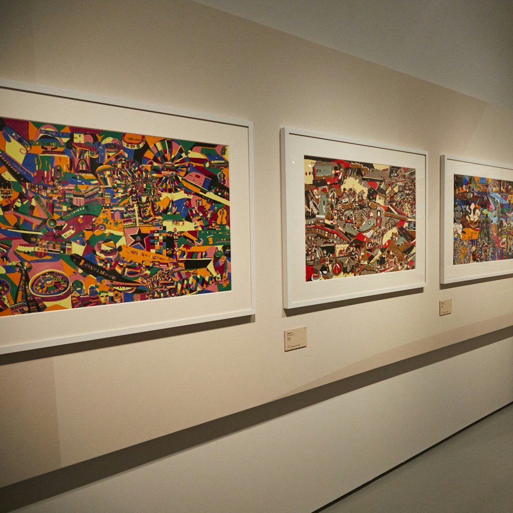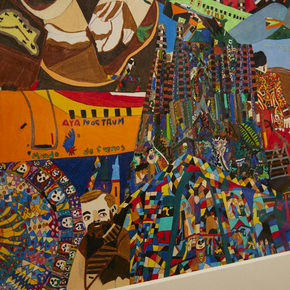 いっぽう、対照的にカラフルな作風の描き手は渡邉あや(1987年新潟県生まれ)。2006年より工房集(埼玉県)に所属。沖縄への修学旅行で飛行機に乗ったことをきっかけに、飛行機を題材に国内外の都市を描くようになったという。ピカソやダリ、サグラダファミリアなど、その国のモチーフをパズルのように構成。水性顔料ボールペンで枠線を描き、色鉛筆でマットに塗り込まれている。見る人の経験が引き出され、作品を通じて会話も弾む。