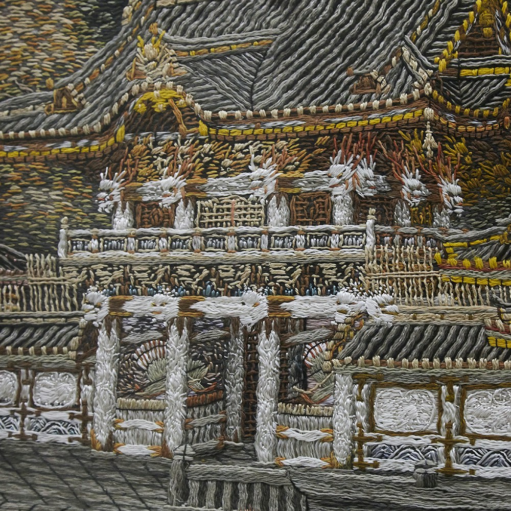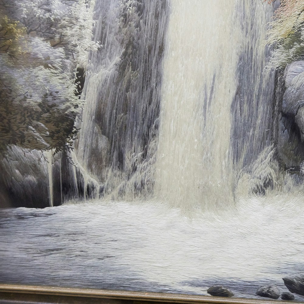 動物画、花鳥画とともに風景画も海外のニーズが高かったが、なかでも水が描かれている作品は、刺繍職人にも絵心が求められた。水の反射や流れるスピード感を表現するため、職人たちは新しい技法や糸の太さや撚りの強弱なども駆使し、絶え間ない研究を重ねていたという。
