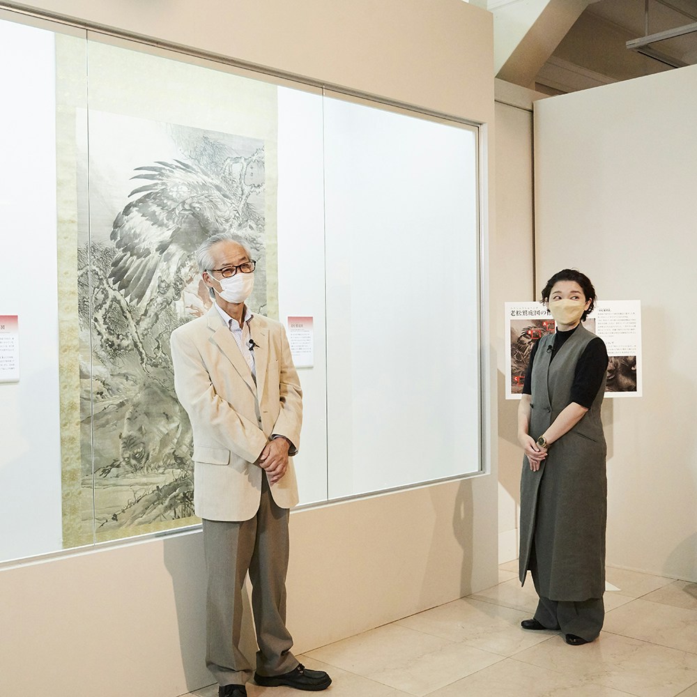 展覧会監修を手がけた京都画壇に詳しい京都女子大学名誉教授・廣田孝は、本作品について「虎の絵で知られる岸竹堂が下絵を描いており、虎や鷹、松が複雑重なりあう複雑な構図」と語る。