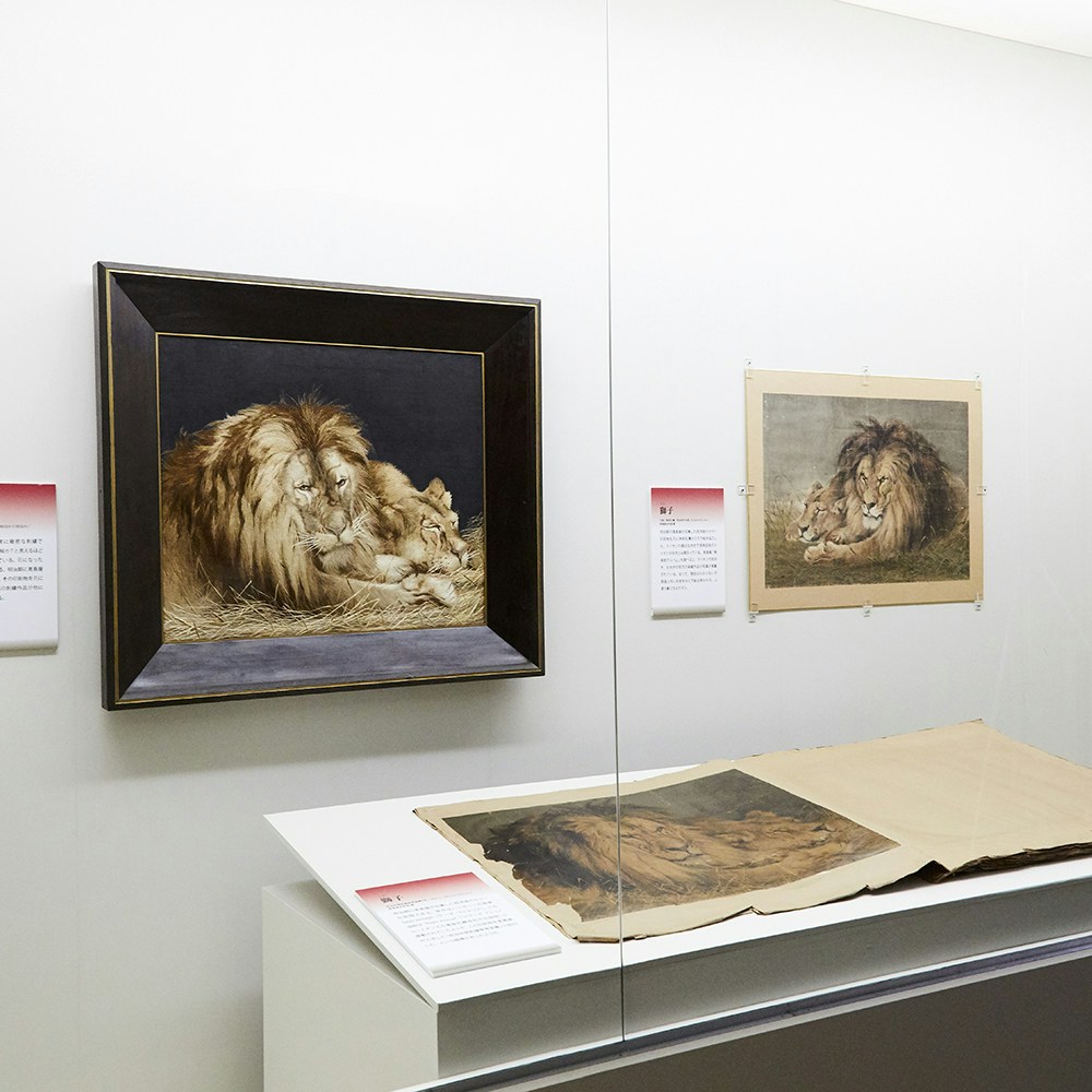 《獅子図》は、髙島屋が明治から大正にかけて欧米に向け輸出した作品のひとつ。下絵を神坂雪佳の弟で日本画家の神坂松濤が手がけている。この下絵にはさらにもととされた絵があり、それはハンガリー人画家でおもにイギリスで活躍したヴァスリフ・ゲーザの油彩画であることが判明。髙島屋がどこからか入手した油彩画のカラー印刷図版をもとに、下絵を製作したと考えられている。展覧会では、この《獅子図》とともに、理由はわからないものの反転した下絵、そして松濤が参考としたであろうカラー印刷図版をあわせて展示している。