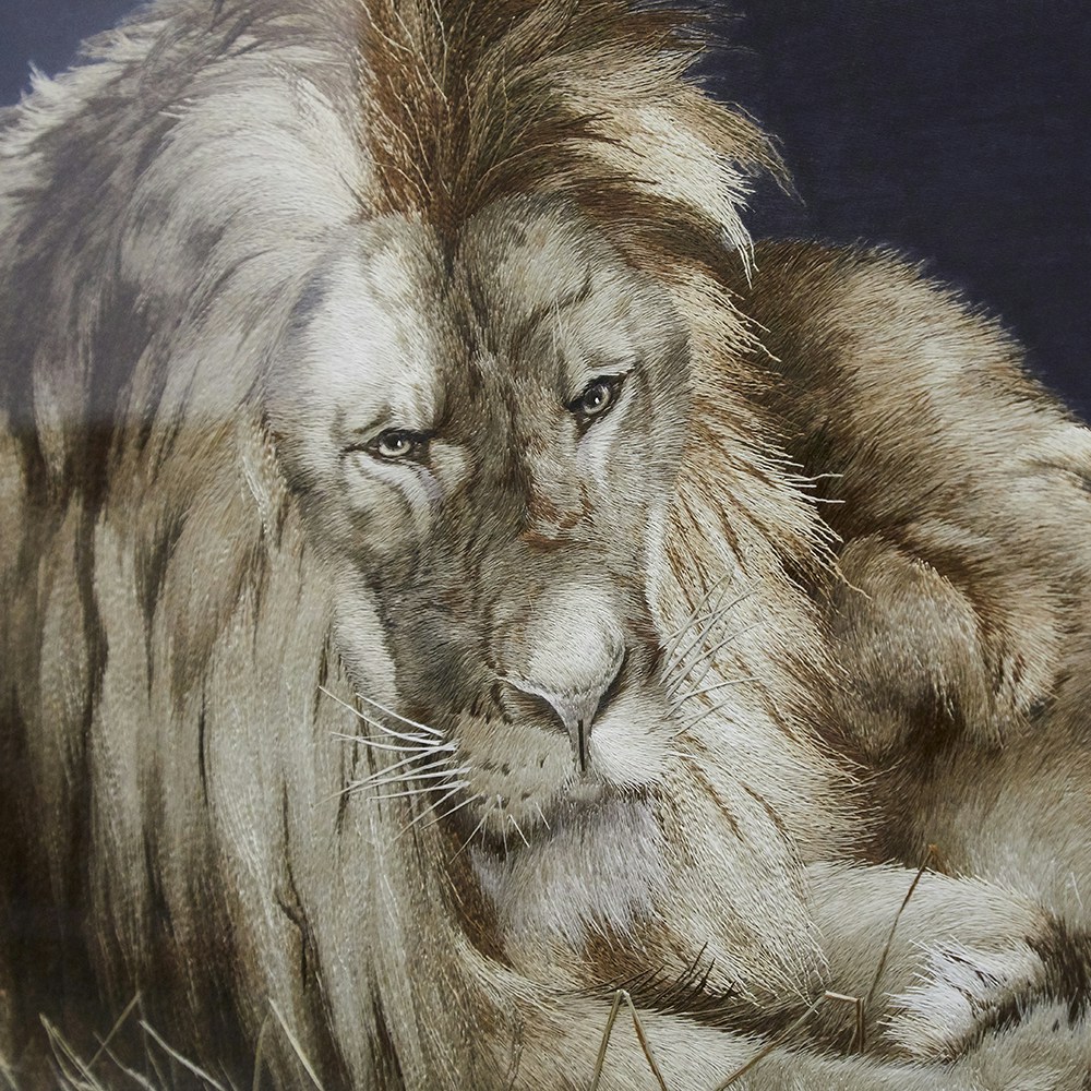 廣田は、この作品について「当時から髙島屋はロンドンに出張所を構えており、刺繍や染色で下絵になりそうな作品を探して日本に送っていたりしたようだ。本作品の原画も、その過程で日本に送られたのではないか」と推測する。そして、松原は次のように語る。「明治時代は様々なモチーフが描かれるようになった。写実的な動物もそのひとつ。ライオンのたてがみの描写の細かさには圧倒されます。糸の向きを変えるだけではなく、糸の撚りの違いで質感を出していたりする。江戸時代までなかった刺繍の技法なども研究されており、その結果がこの表現につながっていると想像できる」。