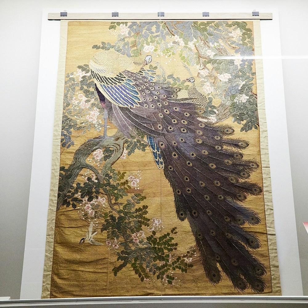 刺繍絵画のモチーフとして動物のほかに、古来から描かれていた花鳥画も人気があったという。《孔雀図緞帳》は下絵を担当したのは明治時代の京都画壇の代表的存在であった今尾景年。製作に約4年かかったそうだ。廣田は日本画の見方で本作を次のように分析する。「孔雀のつがいが木の上に止まっている構図。美しい羽を持つ雄はあえて羽を畳んだ状態でおり、画面の対角線上に羽が広がっているのが見どころのひとつ」。いっぽう松原は次のように評する。「ゴージャスな図柄として人気のある孔雀図は、目がポイント。いい作品は目が『生きている』と言われている。腕のよい職人を呼んできて、目だけを刺繍することもあるほど。本作も、目に肉(刺繍の下に綿を入れたり、ステッチを重ねるなどして、刺繍を立体的に魅せる技法)を入れているのがわかります」。