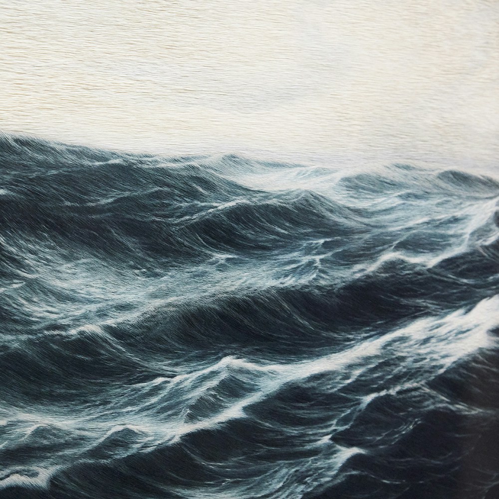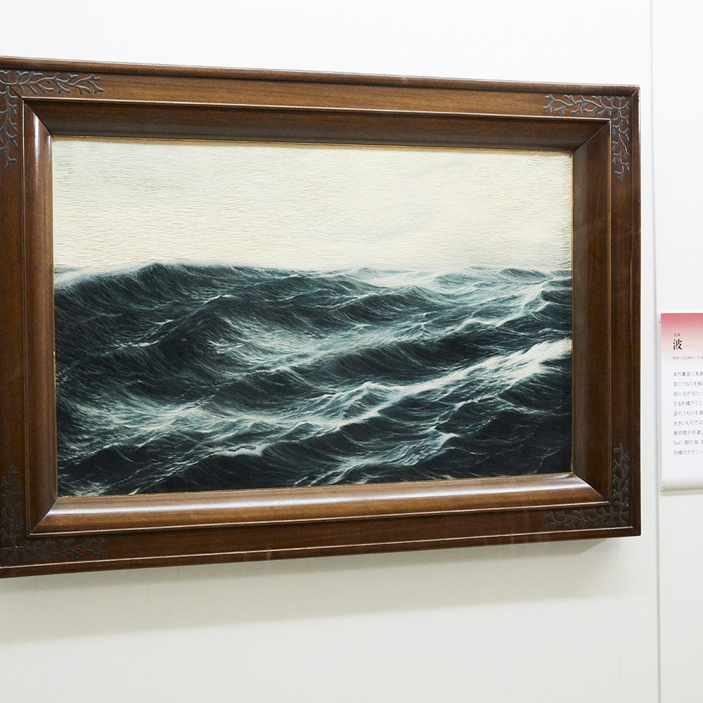 《波》は生地のすべてに刺繍が施されている総刺繍の作品。廣田は本作品を次のように評した。「波のうねる様子、水面に反射する光などが細かく描写されており、空の描写は印象派の影響も受けているかのよう。波を描いた刺繍絵画は他にもあるが、非常に質の高い優れた作品」。また、松原も次のように語る。「波に光が当たって反射する様子は近代ならではの表現です。人気の柄で、同系統の作品も多く製作されており、そのひとつはイギリスのヴィクトリア&アルバート博物館にも収蔵されている」。