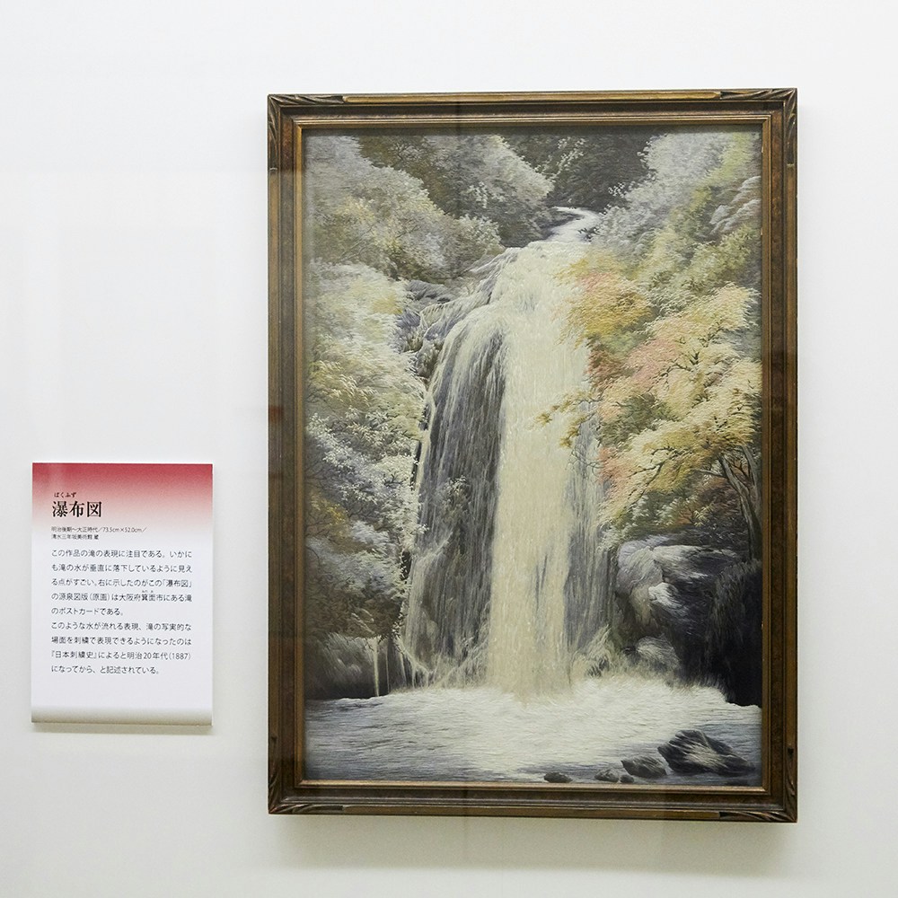 同じように、水の表現に細心の注意が払われた作品が《瀑布図》だ。「この作品は大阪府箕面市にある箕面の滝を描いたものです。同じ構図の絵葉書とともに展示しています。滝の表現はもちろん、紅葉の葉の色づきや、水面に張り出している場面も美しい」(松原)。松原はこの作品を、刺繍絵画の最高峰に位置づけていると評する。「江戸時代に名人と呼ばれていた刺繍職人たちが、写実的な刺繍に取り組んだときに苦労したもののひとつとして『滝』があったと言われています。滝がまっすぐに流れ落ちていく様は、普通の糸でまっすぐに刺繍するとそうめんのように見えてしまう。また、滝壺の水の乱反射は絵画でも表現が難しい。そのため、何度もやり直しを重ねたそうです。川のせせらぎや、滝壺の轟音も聞こえてきそうな作品です」。