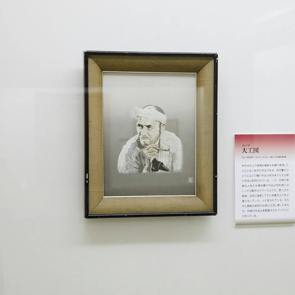 これまでに紹介してきた刺繍絵画と趣が若干異なるのが《大工図》だ。「画面右に繍印で竜という字があります。これは昭和の時代まで京都で製作を続けていた『昇竜』という、職人工房の印。この工房は肖像画や風俗画を得意としていました。まだらなひげまでリアルに表現されている」(松原)。このような肖像画、風俗画もまた日本土産として海外の人々に人気があったという。