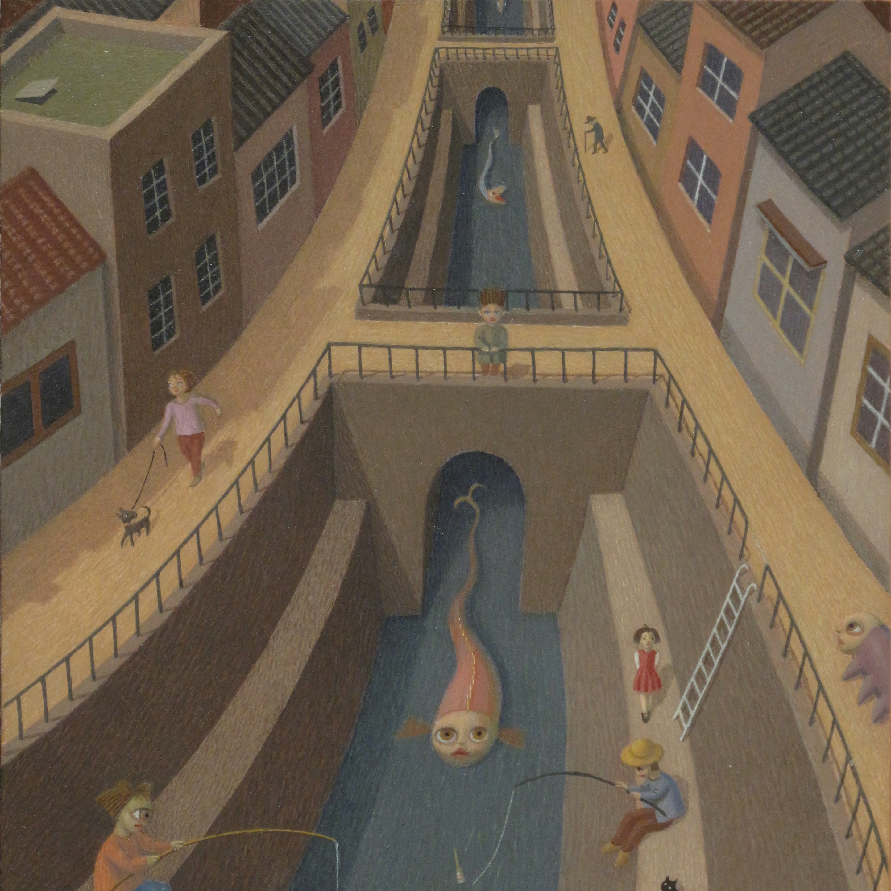 キノコや昆虫などの形態・生態から発想を得て、現実の中に見え隠れする不思議な異世界を描く。本展で展示される《天井川》などの作品は、作家自身が生まれ育ち、現在も住んでいる土地をテーマにしたもの。時代とともに失われゆく風景が描かれている。