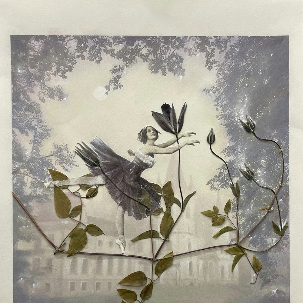コラージュ作家。書籍の装画等多方面で活躍。今回は、押し花を用いたコラージュに色鉛筆、水彩、パステルで着彩を施し、シシリー・メアリー・バーカーの詩を添えた作品を展示。花言葉からインスピレーションを得、詩情あふれる妖精の世界を表現した。