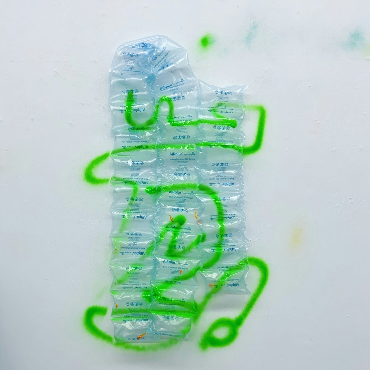 時に布をコンパクトにパッキングし持ち運び、共に旅をするようにして痕跡を残し続けるという作品を制作したり、空気を使って時間の流れの中で変化するという作品を作っている。