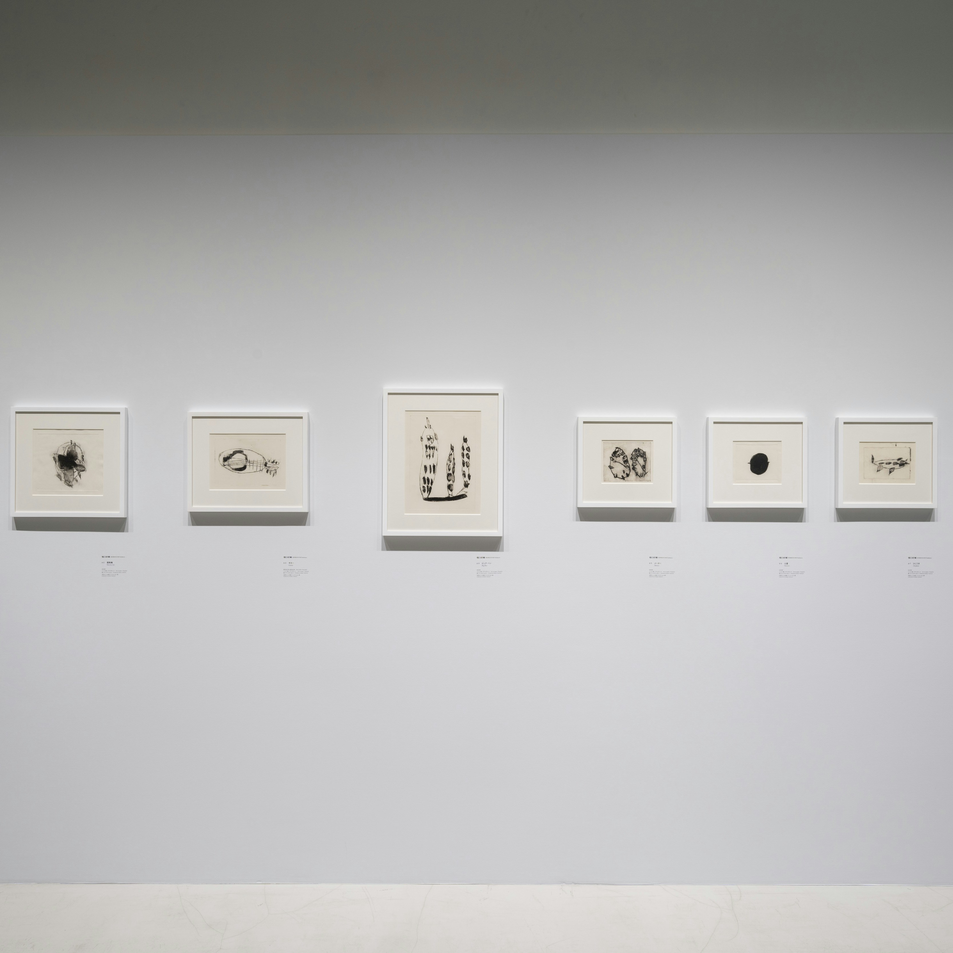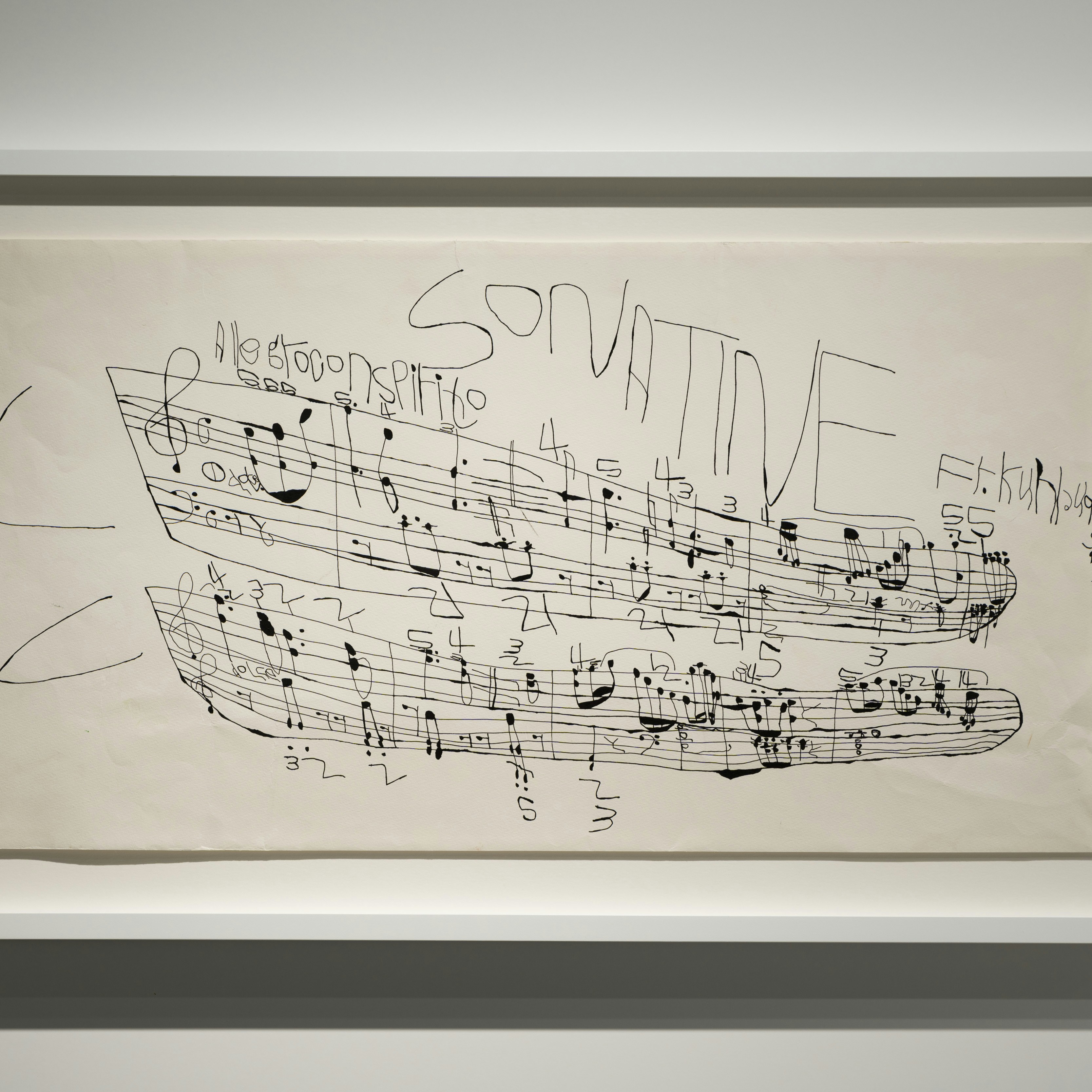 まるで楽曲のメロディを表現するかのように躍動する曲線に目を奪われるが、この曲線をよく見れば、ひと筆で思いのままに描いたのではなく幾重にも線を重ねてフォルムを調整しつつ制作していることがわかる。あまり知られてこなかった墨汁による作品も展示されており、楽譜というモチーフにとらわれてしまうと見逃しそうになる、フォルムへのこだわりが見えてくることも本展の見どころのひとつだ。