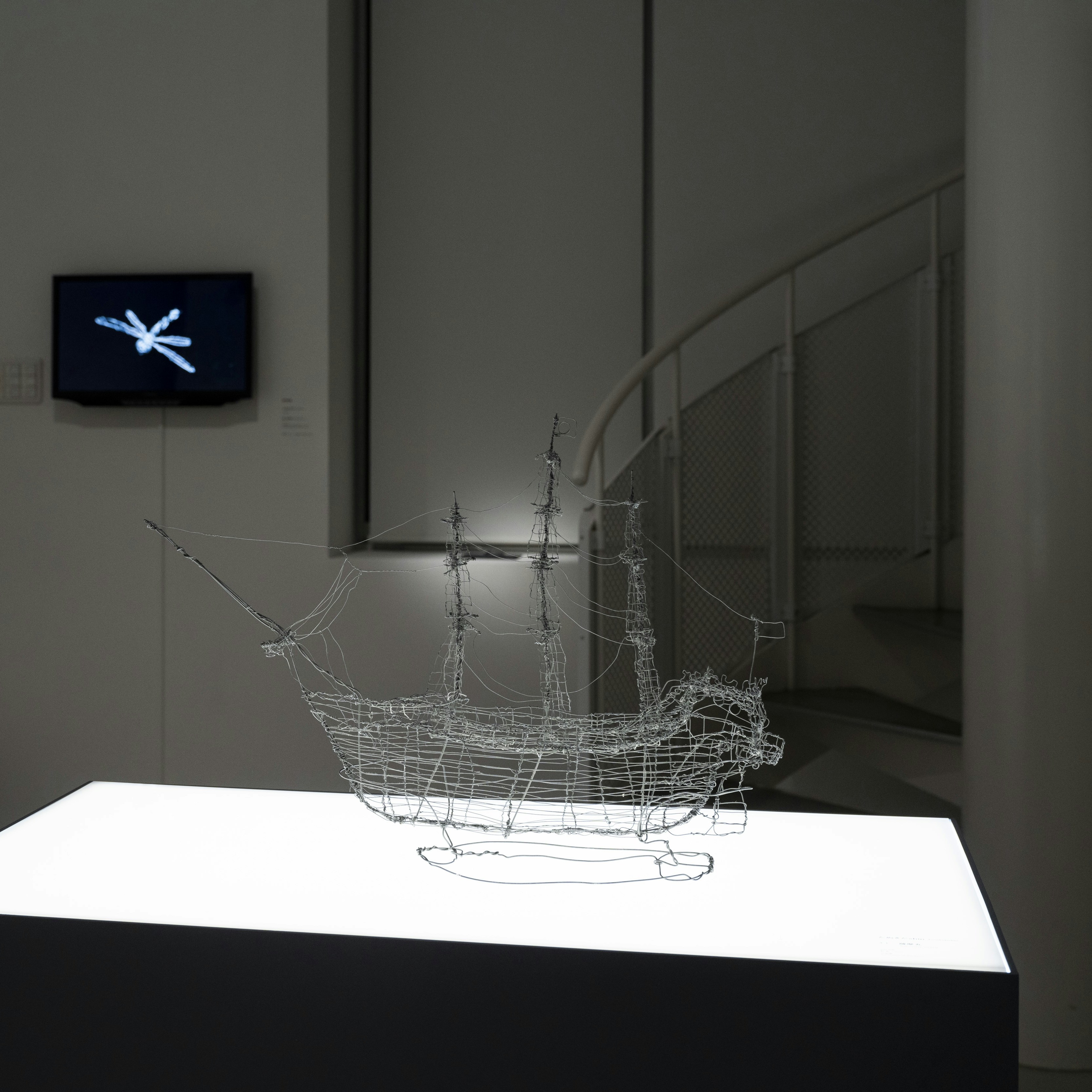 たぬきだshinは1999年兵庫県生まれで、中学3年生のときに針金を素材とした立体作品の造形を始めた。会場に展示された帆船の立体作品は、制作を始めたころの作品とのことだが、必要最低限の針金によって立体的な帆船の形状を余すことなく表現しており、その高い造形性が伝わってくる。