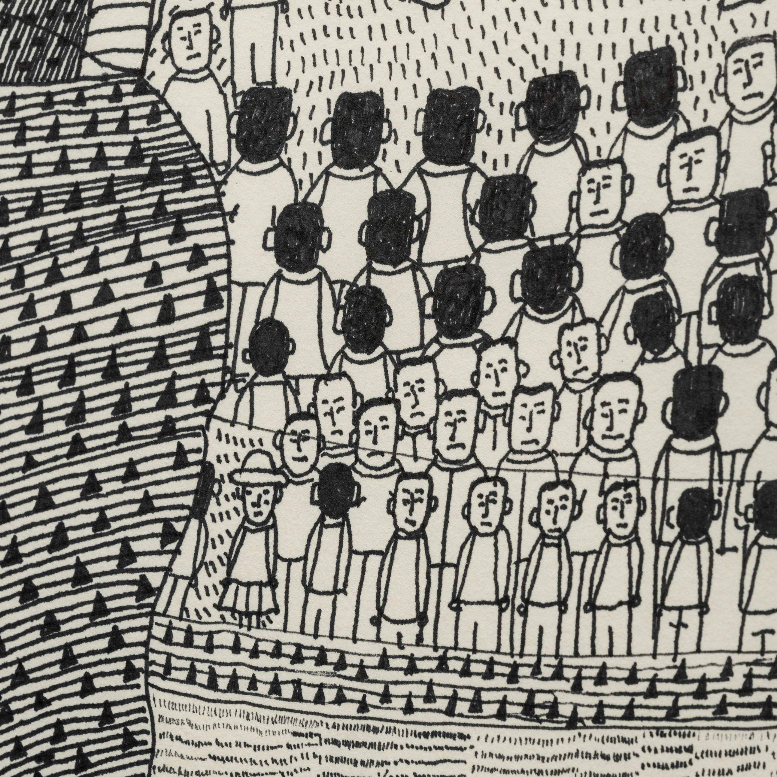 本や写真、実際に見た風景などの記憶をもとに作品を制作した高橋は、カラー作品も多いが、本展ではモノクロの作品のみが集められ、人物一人ひとりの仔細な描写がより伝わってくる。門は、平面と立体が交錯するそのダイナミックな画面構成に注目してほしいと語る。「描きこむことによって生まれる迫力ある線のうねりや、部分ごとに異なる立体感を持つコラージュ的な観点など、ずっと見ていても見飽きない奥深さがあります。また、群衆のなかにこちらを見ている人が突然現れるなど、高橋氏らしいユーモアも楽しいです」。