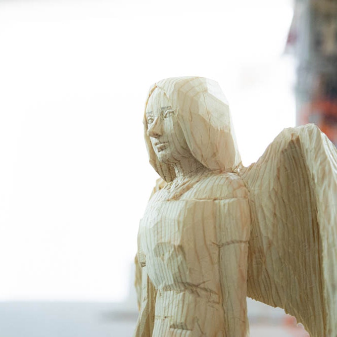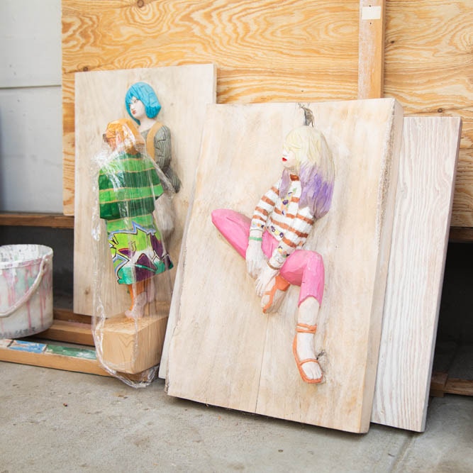 だからでしょうか。飯沼さんの作品を見たときに、ルミネという商業施設に馴染みながらも、その作品のなかに社会を見つめる視点が宿っているところにとても惹かれました。木彫の質感も魅力的でしたし、モチーフとなった人々のファッションも現代を映し出していると感じられたんです。