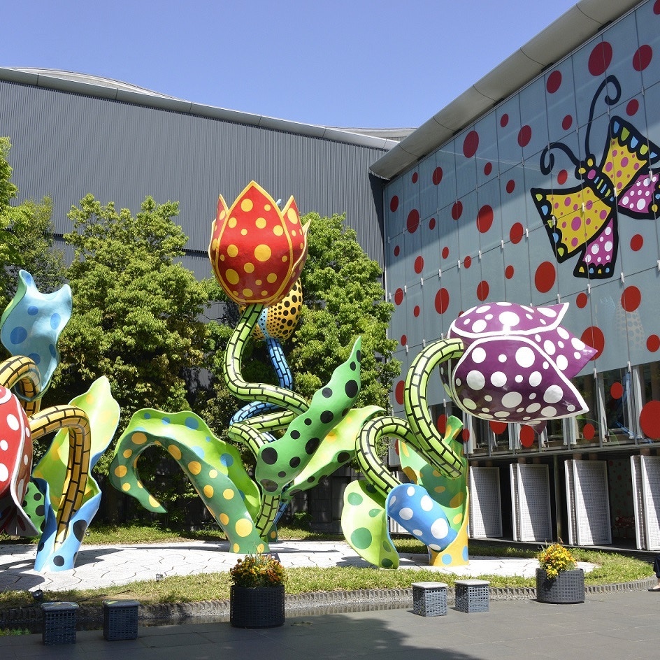 同館の前にある高さ10メートルを超える巨大なパブリック彫刻《幻の華》(2002)は、世界中から訪れる鑑賞者を迎える。同作は、草間の野外彫刻では世界最大規模のものであり、2002年の同館開館時に委託制作された。チューリップの花をモチーフにした巨大な彫刻は力強く成長するように様々な方向に伸び、カラフルな表面には草間の象徴的な水玉が覆われている。